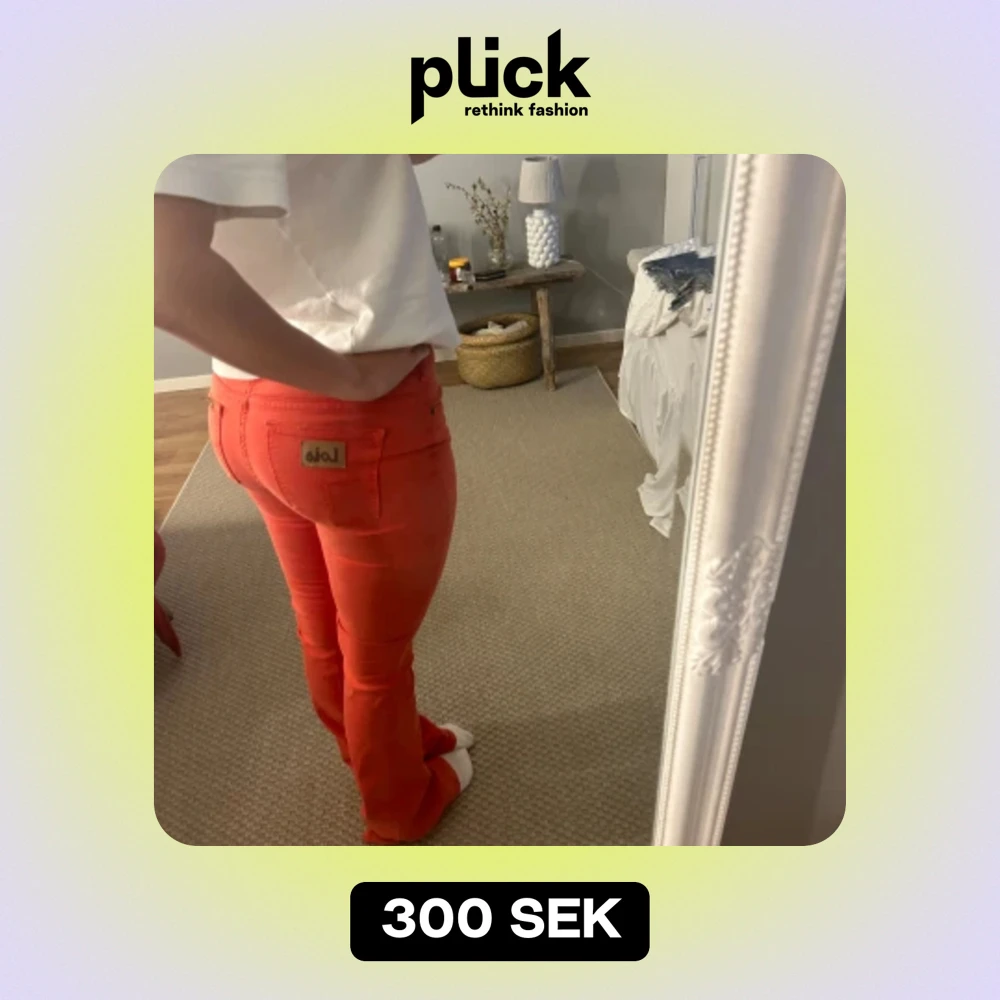 Orangea/korall färgade jeans från lois. Toppskick. De är även stretchiga i materialet. Älskar de men de är tyvärr för tajta över lår och höfter på mig. Midjemått:33cm rakt över. Innerbenslängd: 79cm
