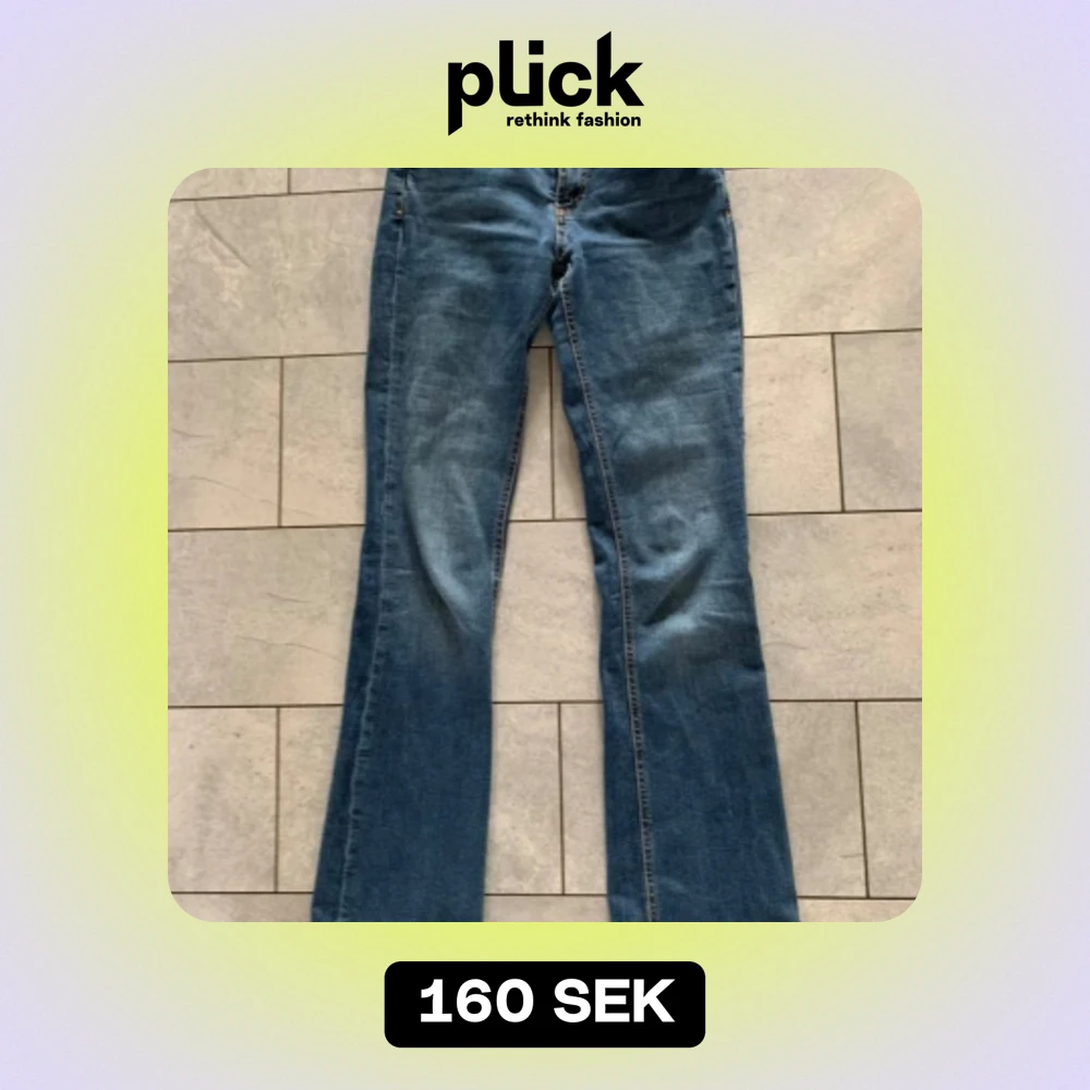 Ett par blåa low waist bootcut jeans från zara. Bra skick. Midjemått: 34 cm Innerbenslängd: 80 cm