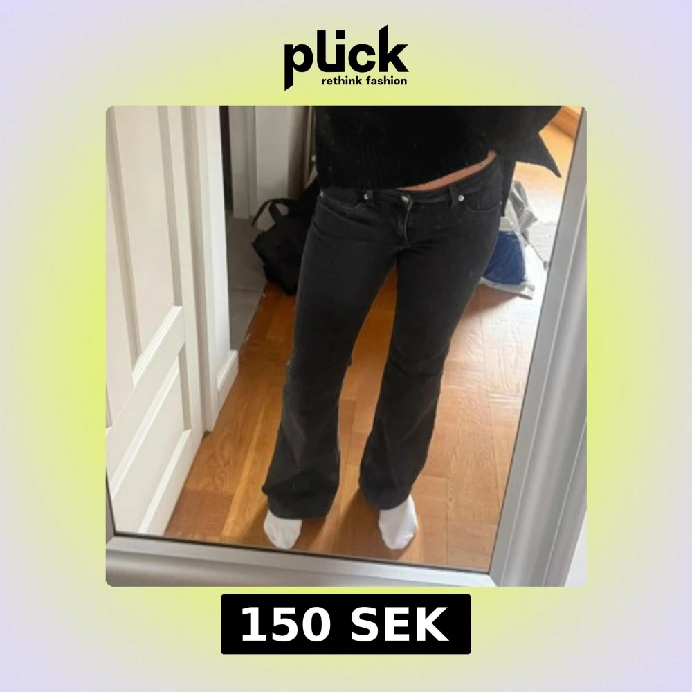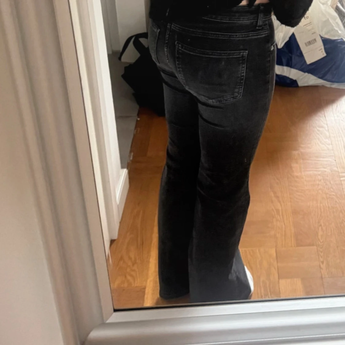 Snygga svarta jeans från HM med flare passform och klassisk femficksdesign. Jeansen har låg midja och är tillverkade i stretchigt denim för en bekväm känsla.