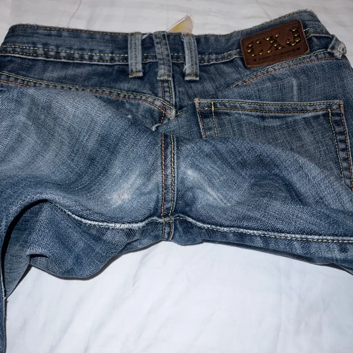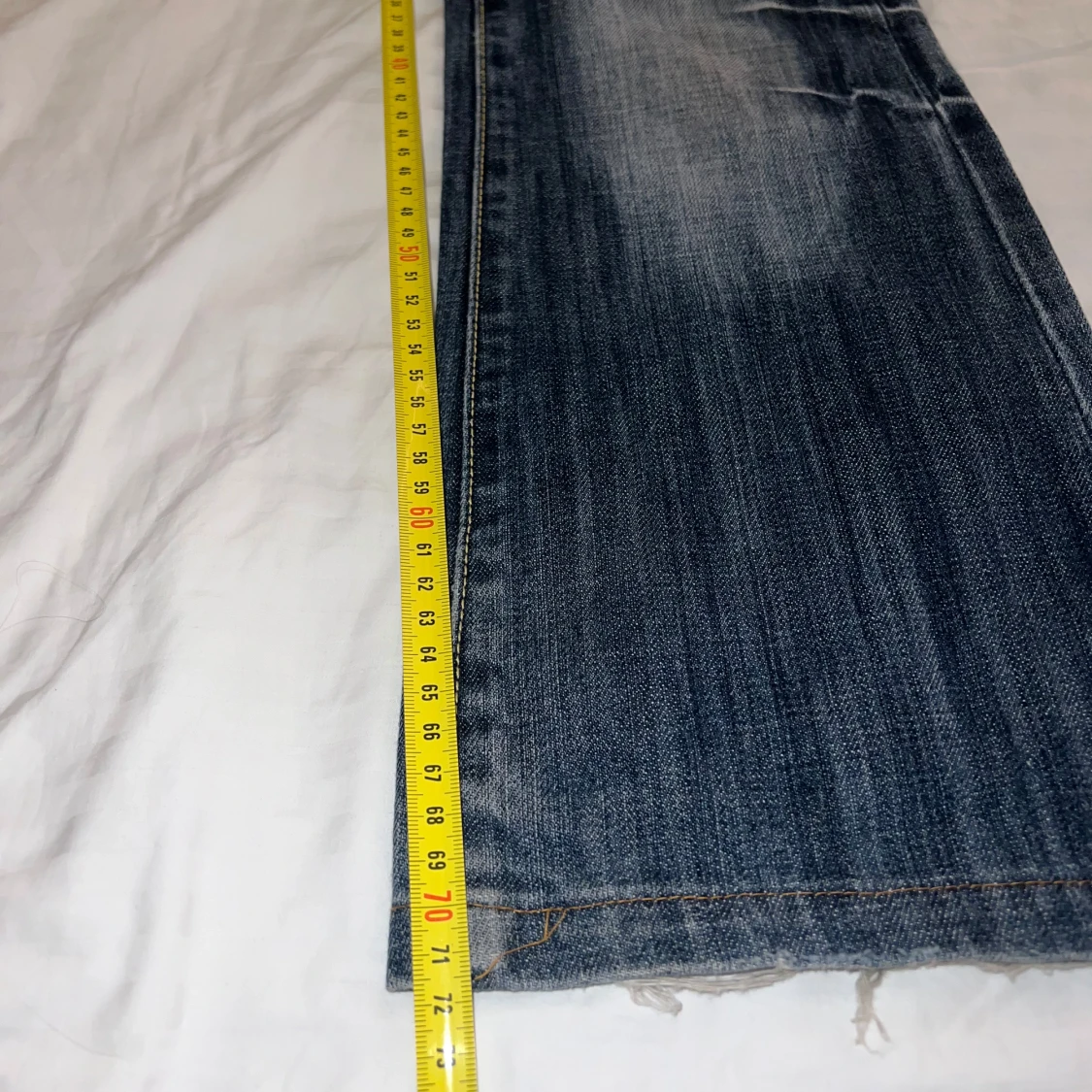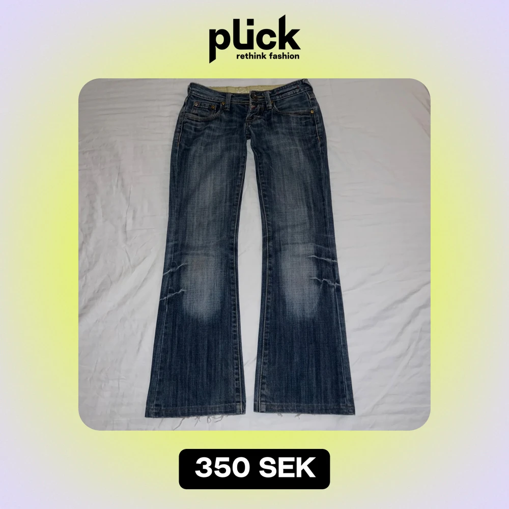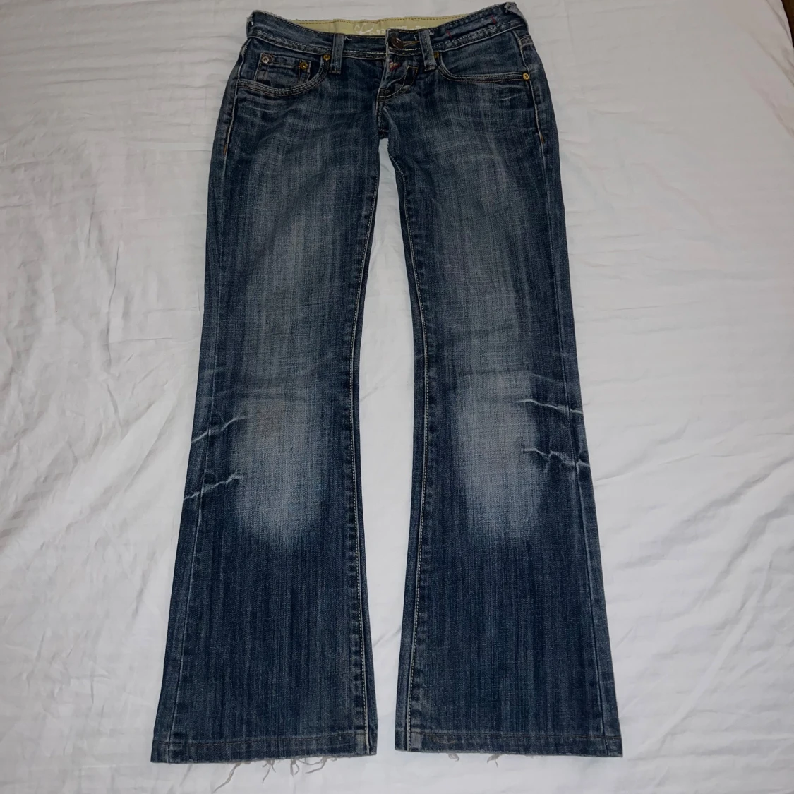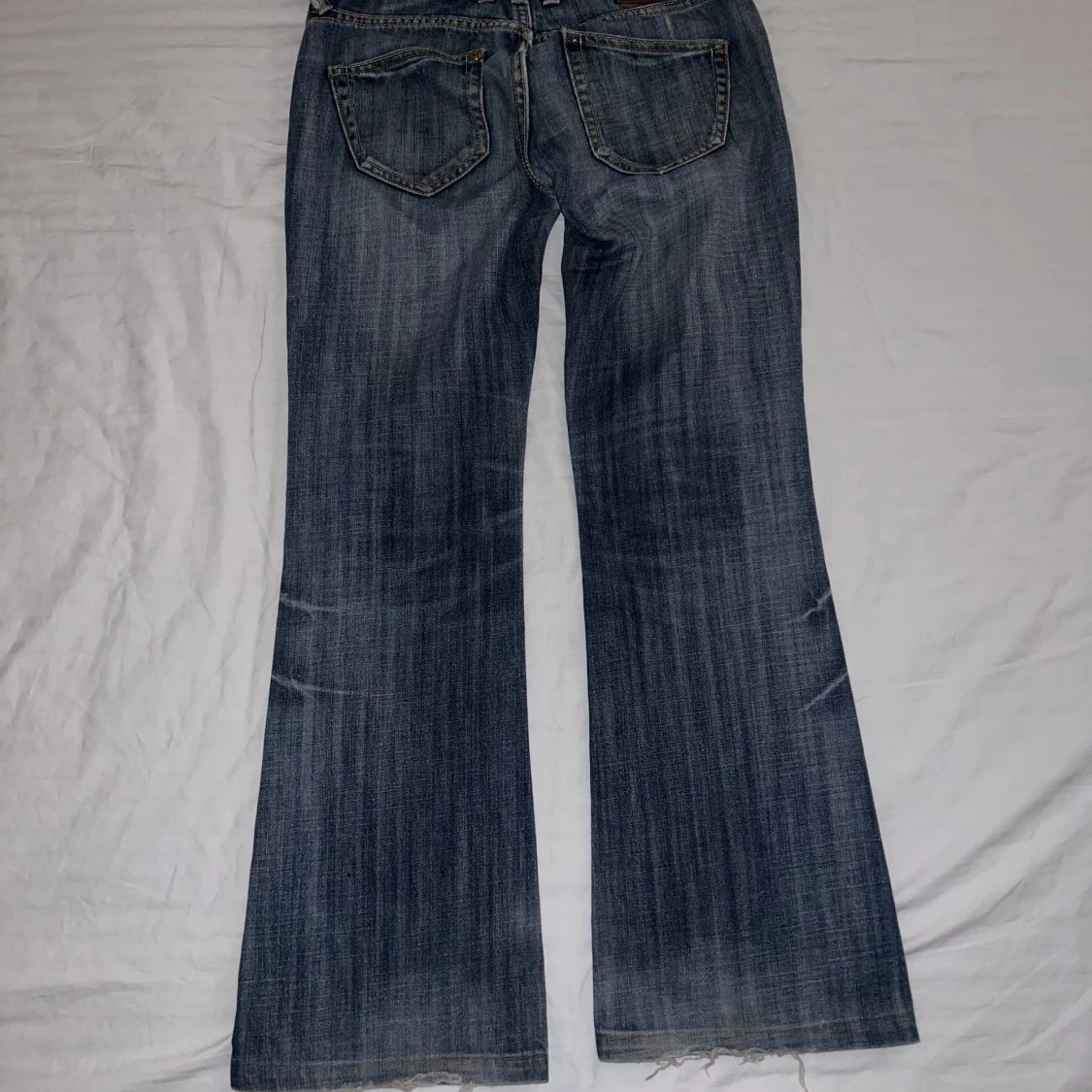 Såå snygga mörkblå, lågmidjade utsvängda jeans med snygga detaljer. Några få defekter men ingen man tänker på (se bilder), måtten finns också bland bilderna💕