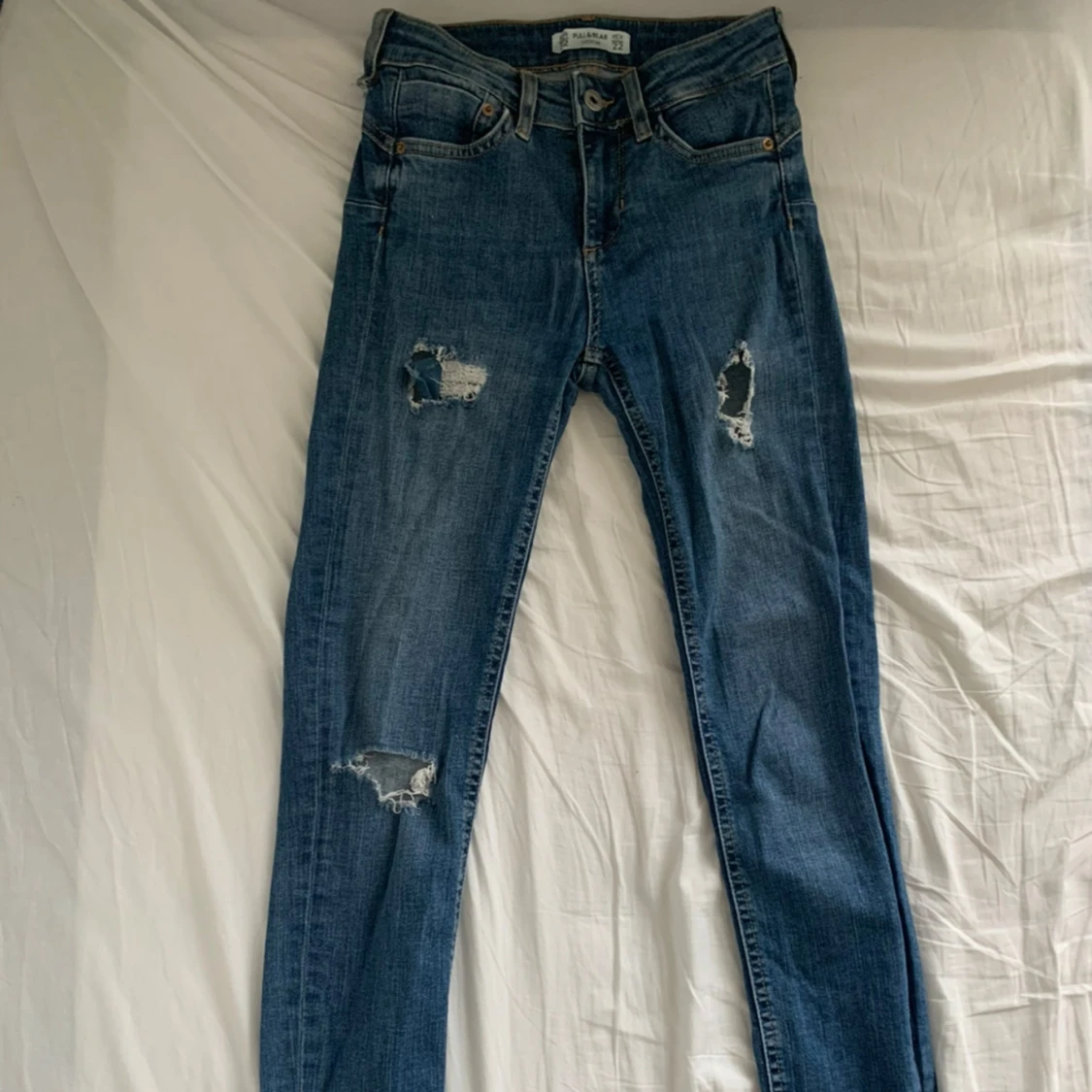Snygga lågmidjade ripped jeans från Pull & Bear! Dessa var mina favoriter då dom är bekväma, snygga och har en fin passform. Jeansen har ett litet hål på sidan som inte syns så tydligt och som enkelt kan fixas (se sista bilden). Storlek 32. Pris kan diskuteras 💙 TIPS: super snygga under ett par höga stövlar!