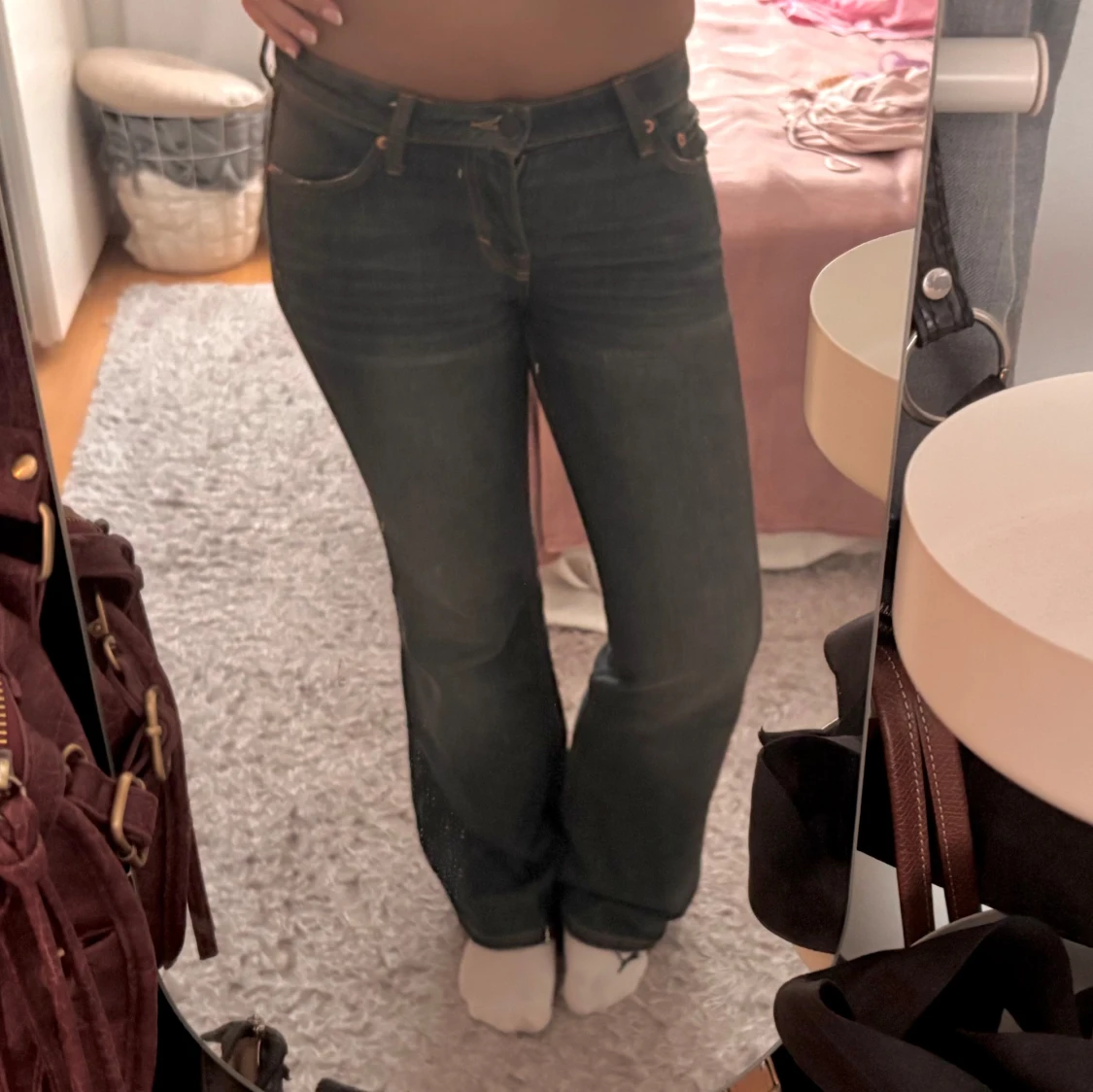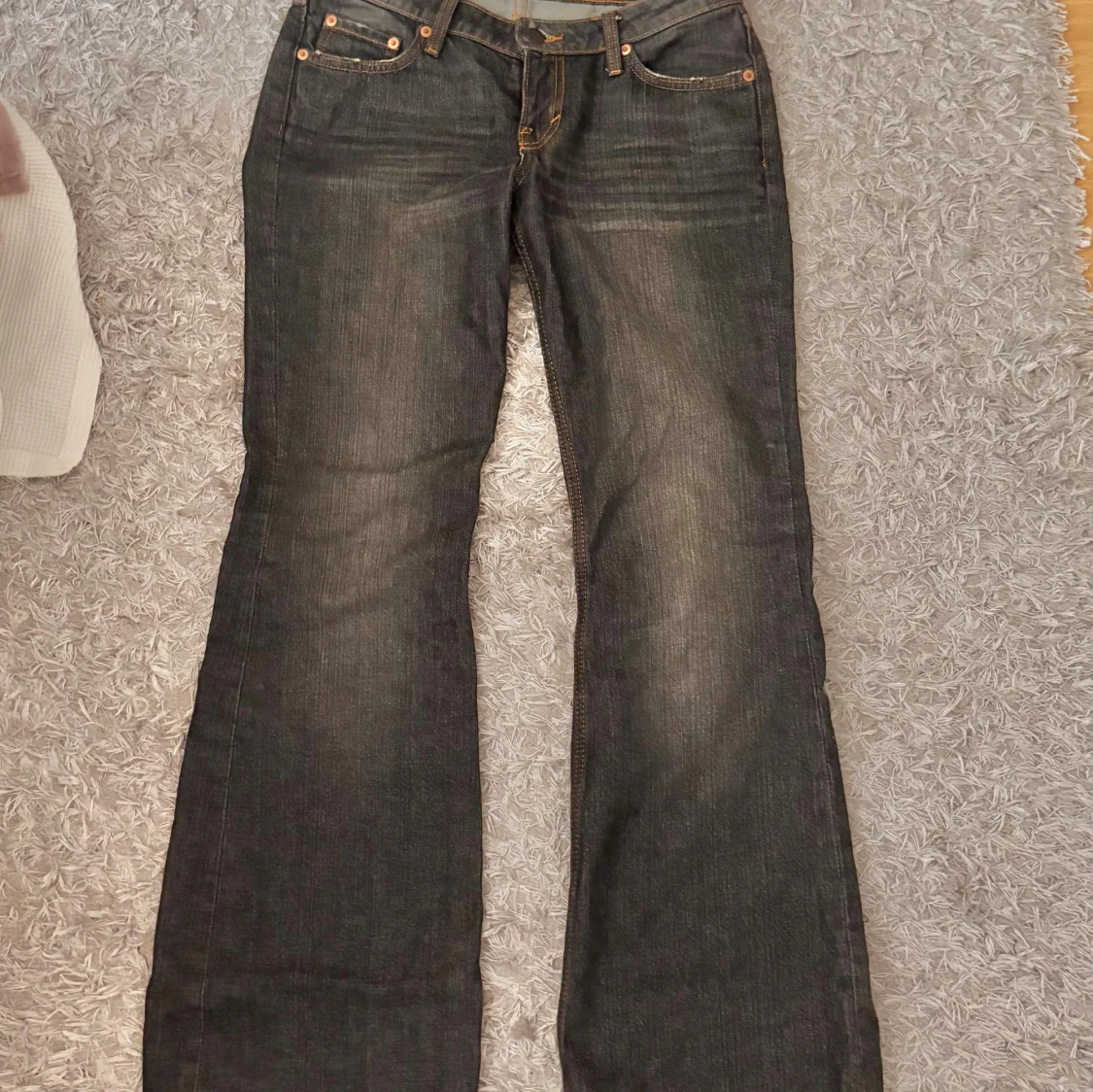 Säljer ett par svarta bootcut jeans som är väldigt low waist!! De är verkligen jättefina o sitter så bra!! Midjemåttet är 37cm och innerbenslängden är 78cm❤️