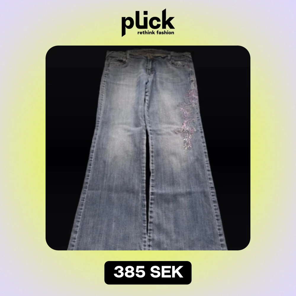 Low waist bootcut jeans med broderade blommor på sidan av benet! Super fina men inte min stil längre 💓Längd 108 cm ytterben, midja 47 cm rakt över och benöppning 27 cm (längst ner på byxan) 💓