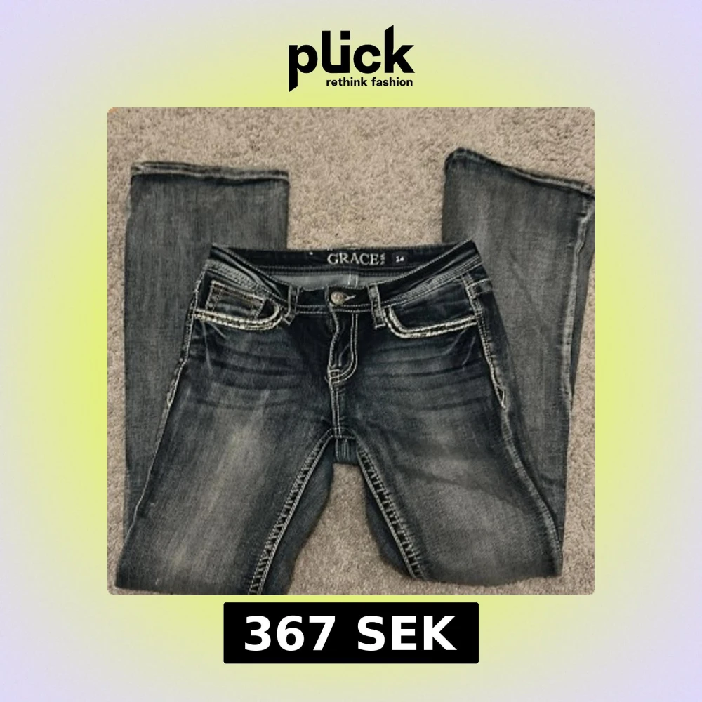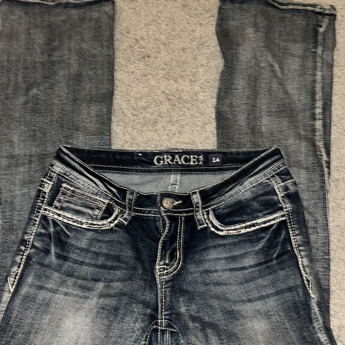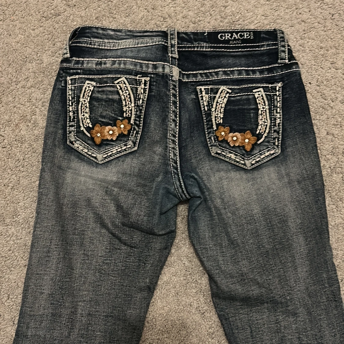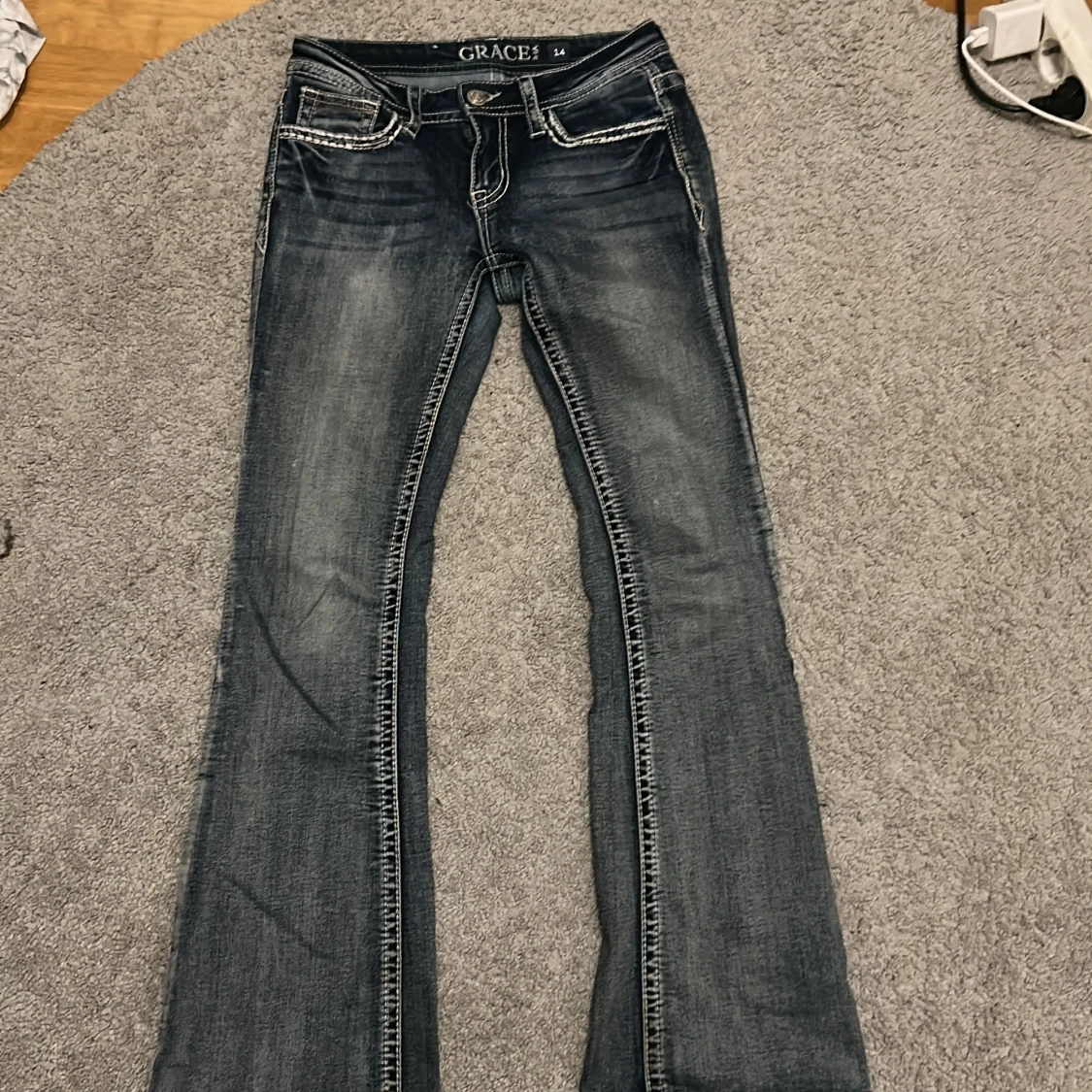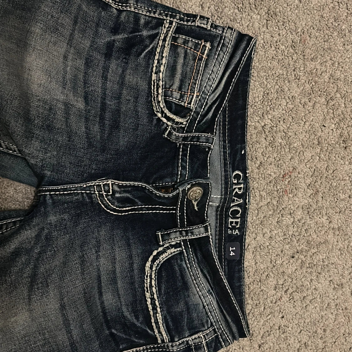 Snygga mörkblå jeans med låg midja från Grace in LA med slitningar och kontrastsömmar. Bakfickorna har broderade detaljer och små blommor. Klassisk femficksmodell med knapp och dragkedja. Perfekta för dig som gillar jeans med lite extra detaljer. Storlek 14 men skulle säga att de passar folk med storlek 152. Säljer då de är försmå. Köpts för 900kr
