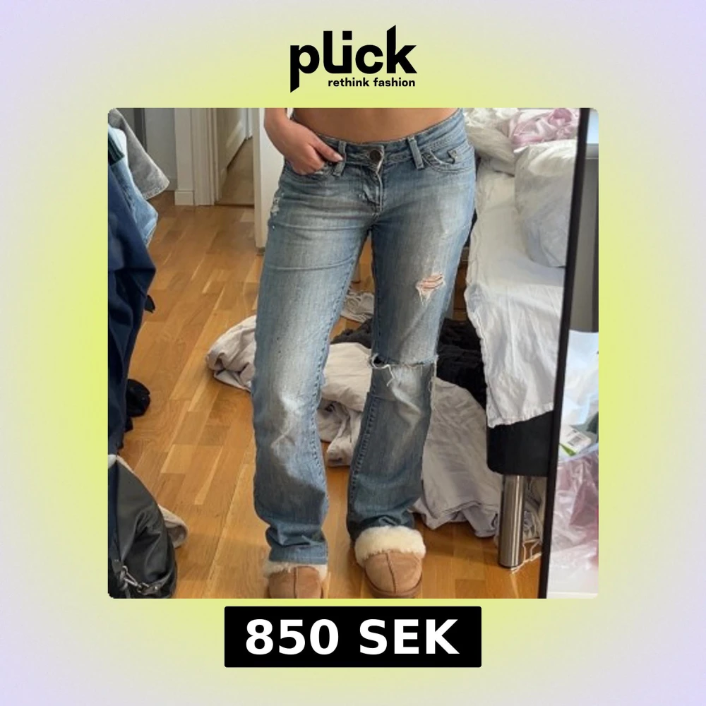 Supersnygga lowwaist bootcut jeans med hål i!! Lagade och har lite hål där bak (se bilderna bakifrån) passar perfekt nu till vår! Midjemått: 37cm tvärs över. Innerbenslängd: 80cm. Hör av er vid frågor! 💓