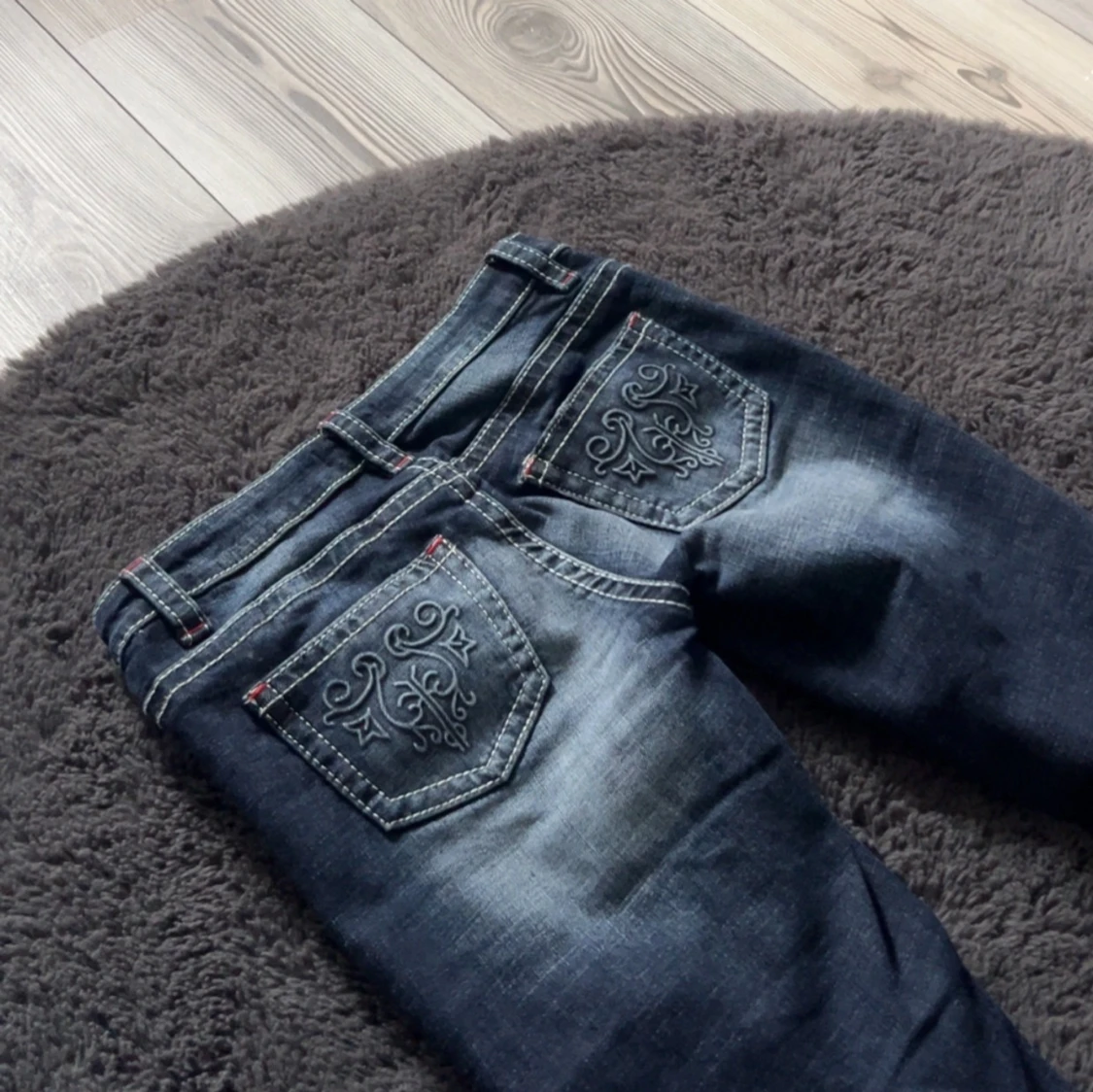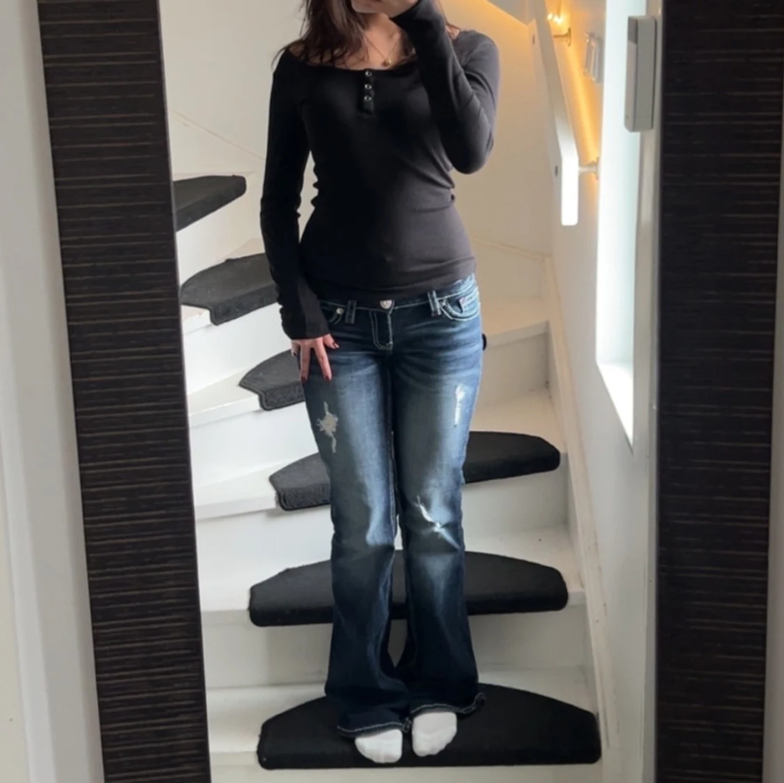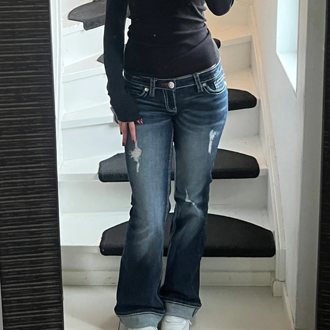 Säljer ett par jätte snygga lågmidjade flared/bootcut jeans från Gina Tricot i storlek 164. Jag är 1,60 m lång och skulle säga att de passar storlek W26/S. Jeansen är helt oanvända. Midjemått: 37cm. Innerbenslängd: 79/80cm.💗