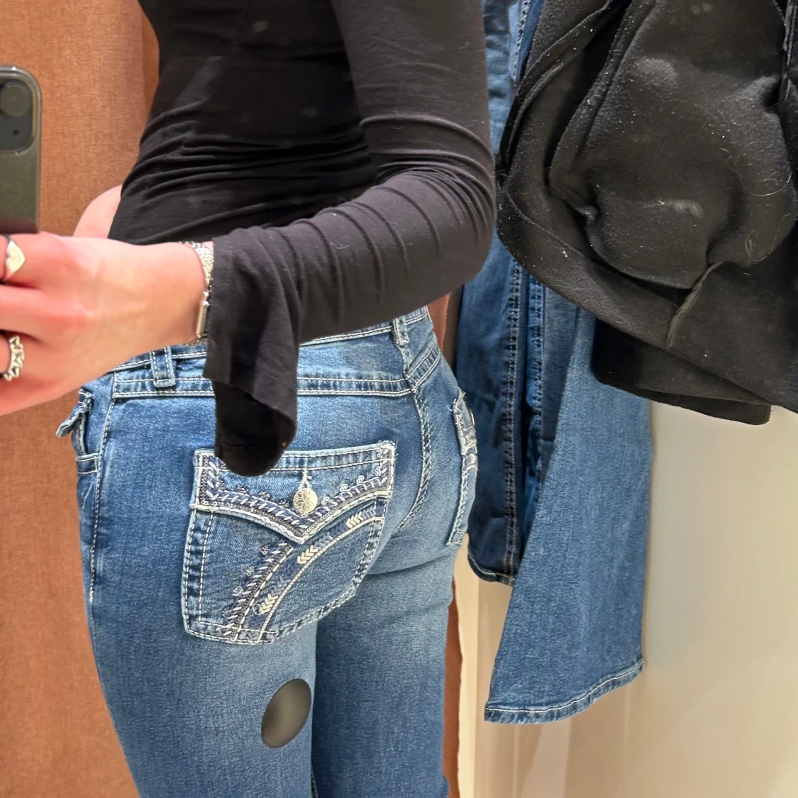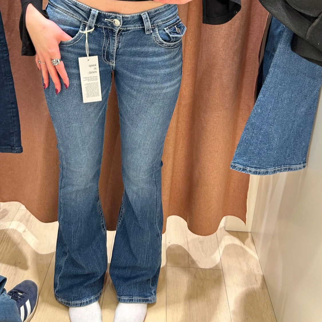 Jättesnygga Low waist jeans ifrån Gina tricot ! Dem är boot cut och Super sköna och fina , dem är helt oanvända och säljer då dem inte passade mig så bra. Storleken är M men väldigt små så skulle säga mer som S kanske Xs 🩷