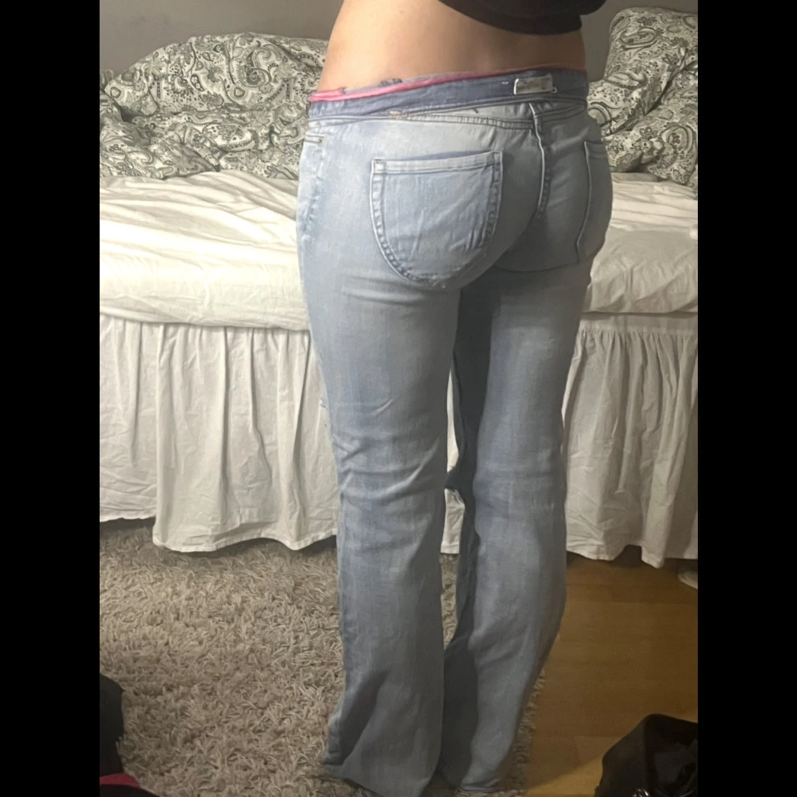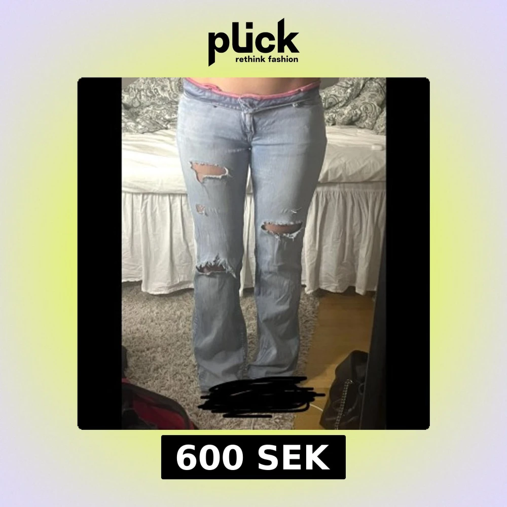 Säljer ett par ljusblå låg midjade jeans med bootcut passform och snygga slitningar på båda benen. Jeansen har klassisk femficksdesign och låg midja. Perfekta för dig som gillar en avslappnad och trendig look.