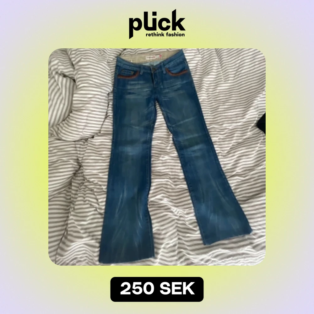 As snygga Low Waist bootcut jeans med broderi på fickorna. Köpta här på Plick men passade tyvärr inte mig. Är i mycket bra skick förutom att broderiet börjat flagna lite på ena bakfickan. Kontakta vid intresse/frågor! Pris kan förhandlas💞