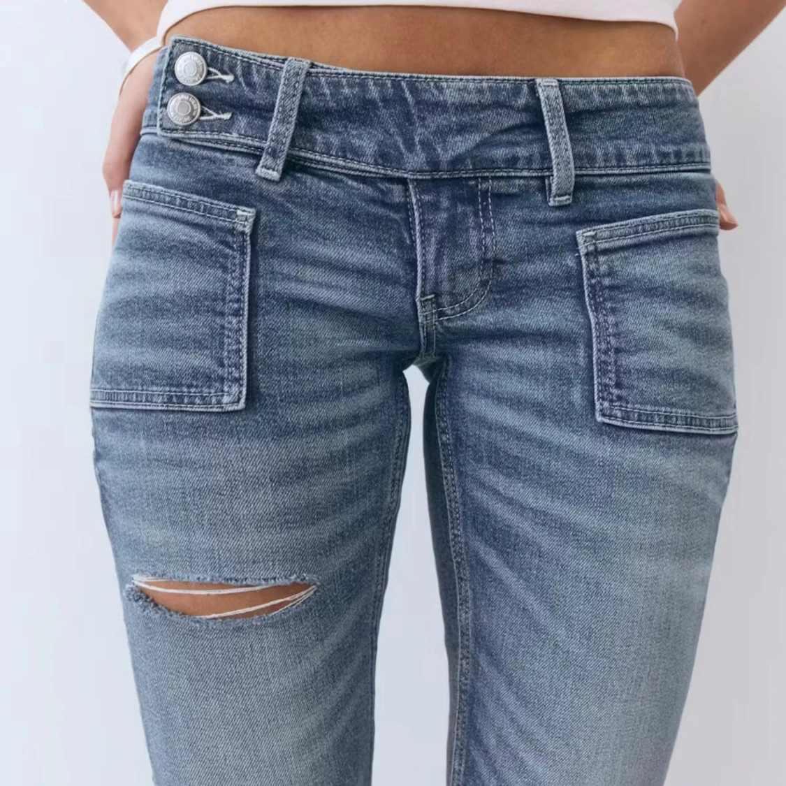 Ginatricot ny lanserade Young 14+ years flare jeans med slitna detaljer framtill som är helt slutsålda i XS. Jeansen är ljusblåa och har låg midja. De har utsvängda ben, låg stretch, dragkedjegylf, dubbla knappar i sidan och fickor fram och bak. Priset går att diskuteras❣️❣️