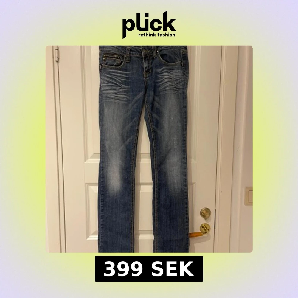 Snygga blå jeansbyxor från Antique Rivet med slitningar och kontrastsömmar. Lågmidjade och strechiga, raka i benen.