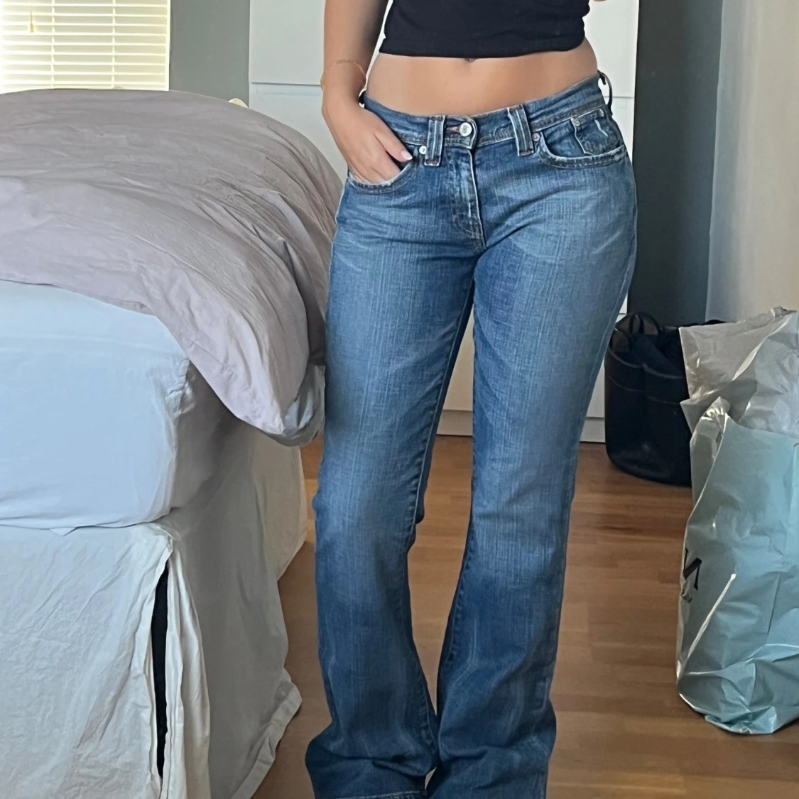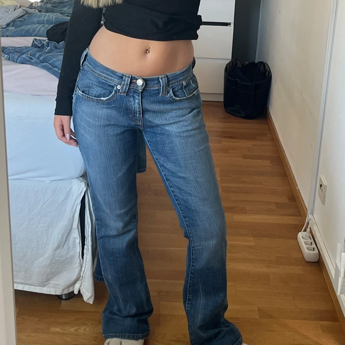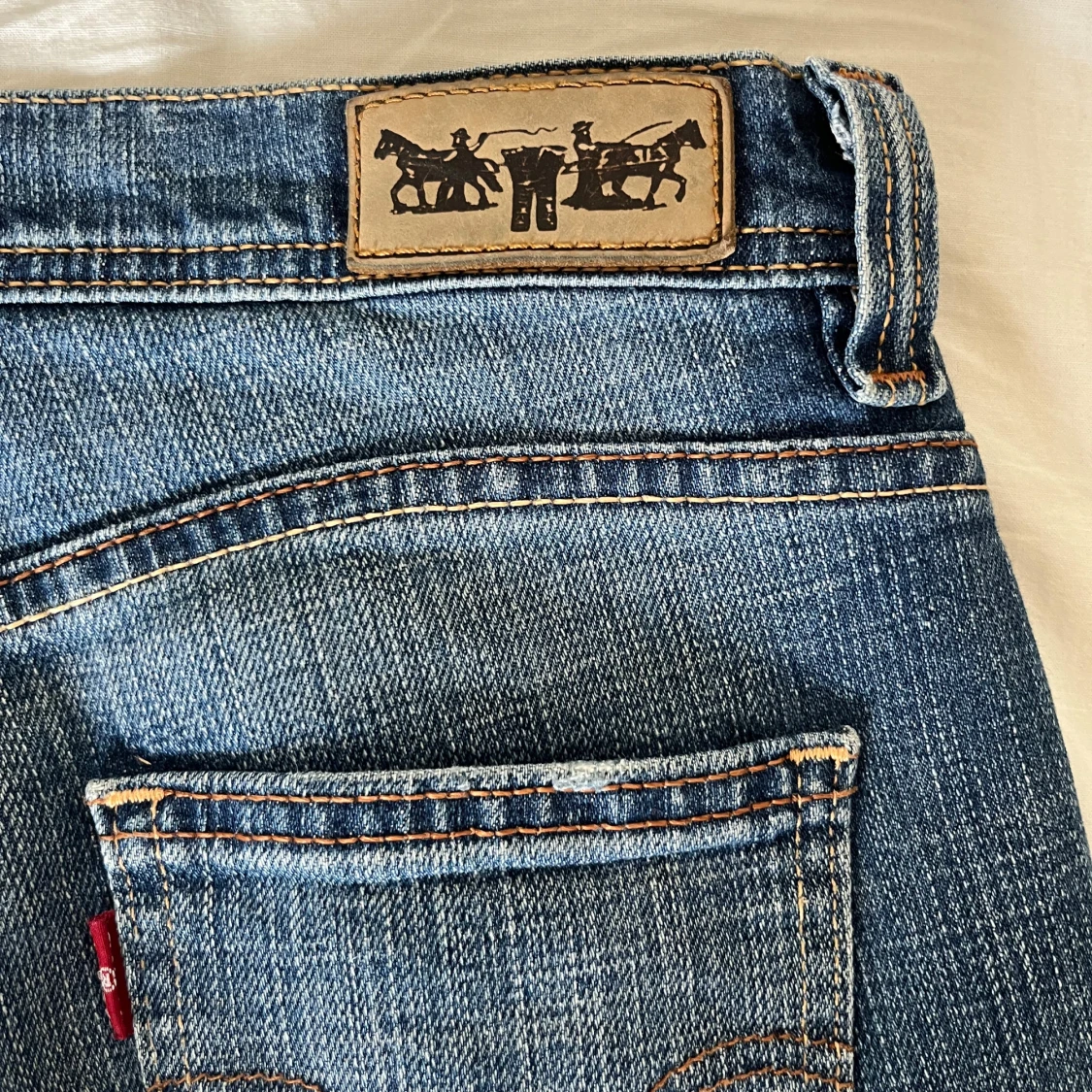 Säljer ett par Levis jeans i klassisk blå tvätt. Modellen har låg midja och bootcut-ben, vilket ger en snygg retrovibe. Jeansen är i denim med fem fickor och Levis-logga på bakfickan. Perfekta för dig som gillar en avslappnad men ändå stilren look. Uppskattad storlek - XS/S, jag är 160 som referens!