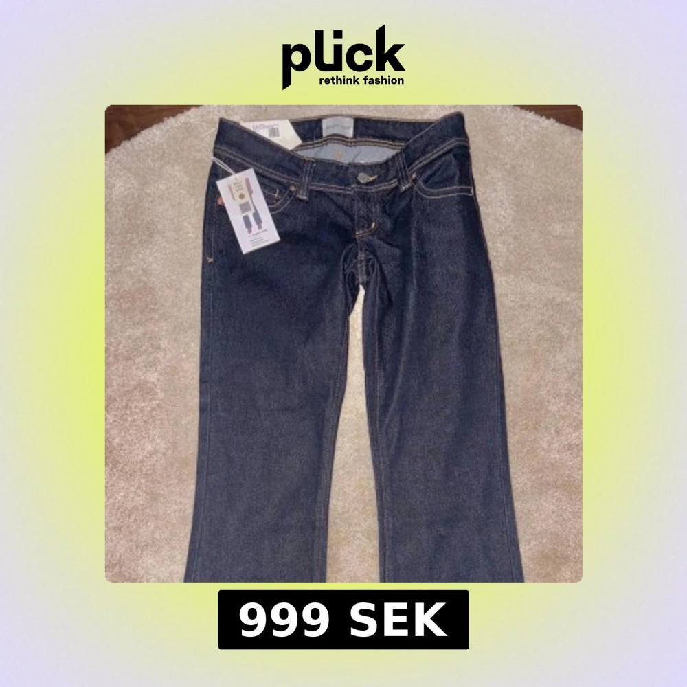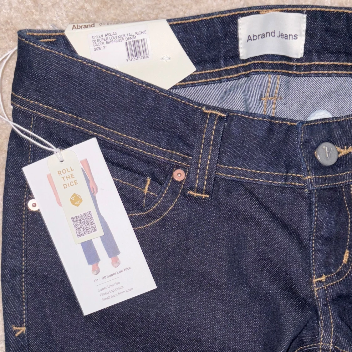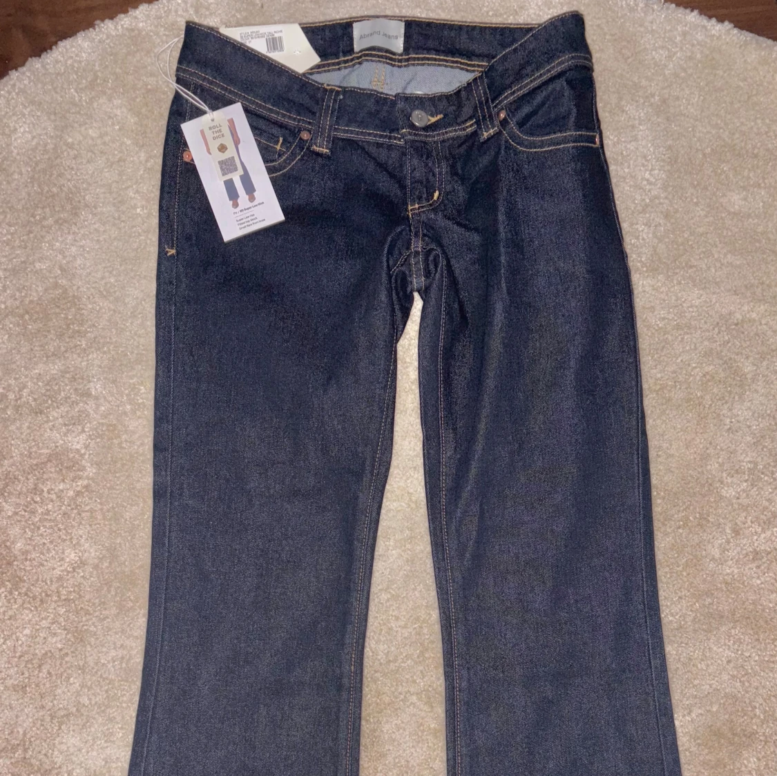 Helt nya oanvända Mörkblå jeans från Abrand med låg midja och bootcut-snitt. Klassisk femficksmodell med kontrastsömmar och liten utsvängning från knäna. Tillverkade i kraftigt denimtyg för en tidlös look.