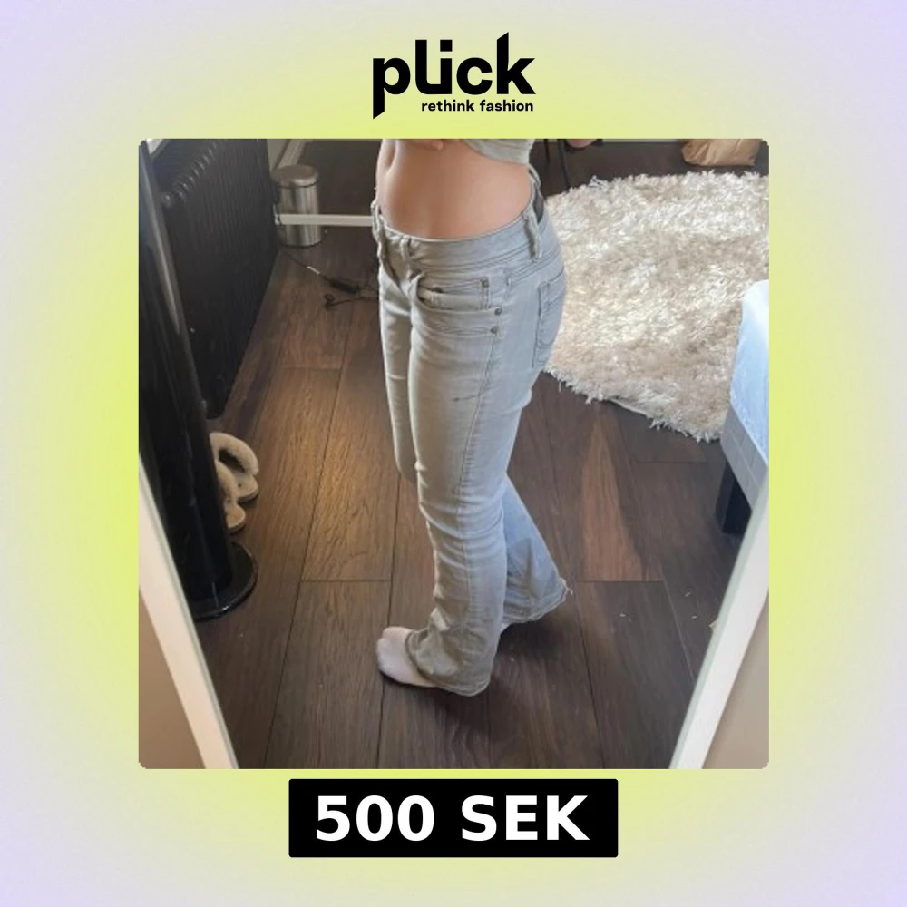 Säljer ett par ljusblå jeansbyxor med bootcut-modell och låg midja. Byxorna har klassisk femficksdesign och stängs med dragkedja och knapp. Perfekta för dig som gillar en retroinspirerad look.