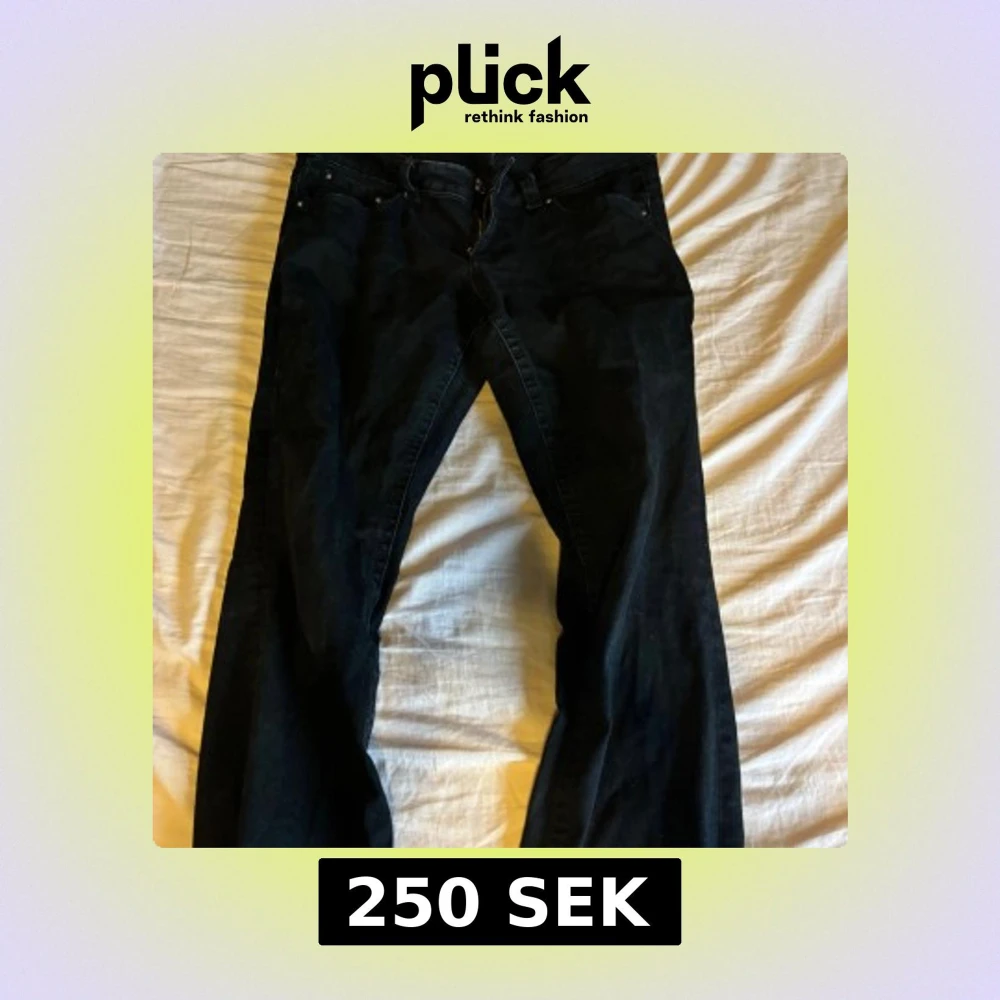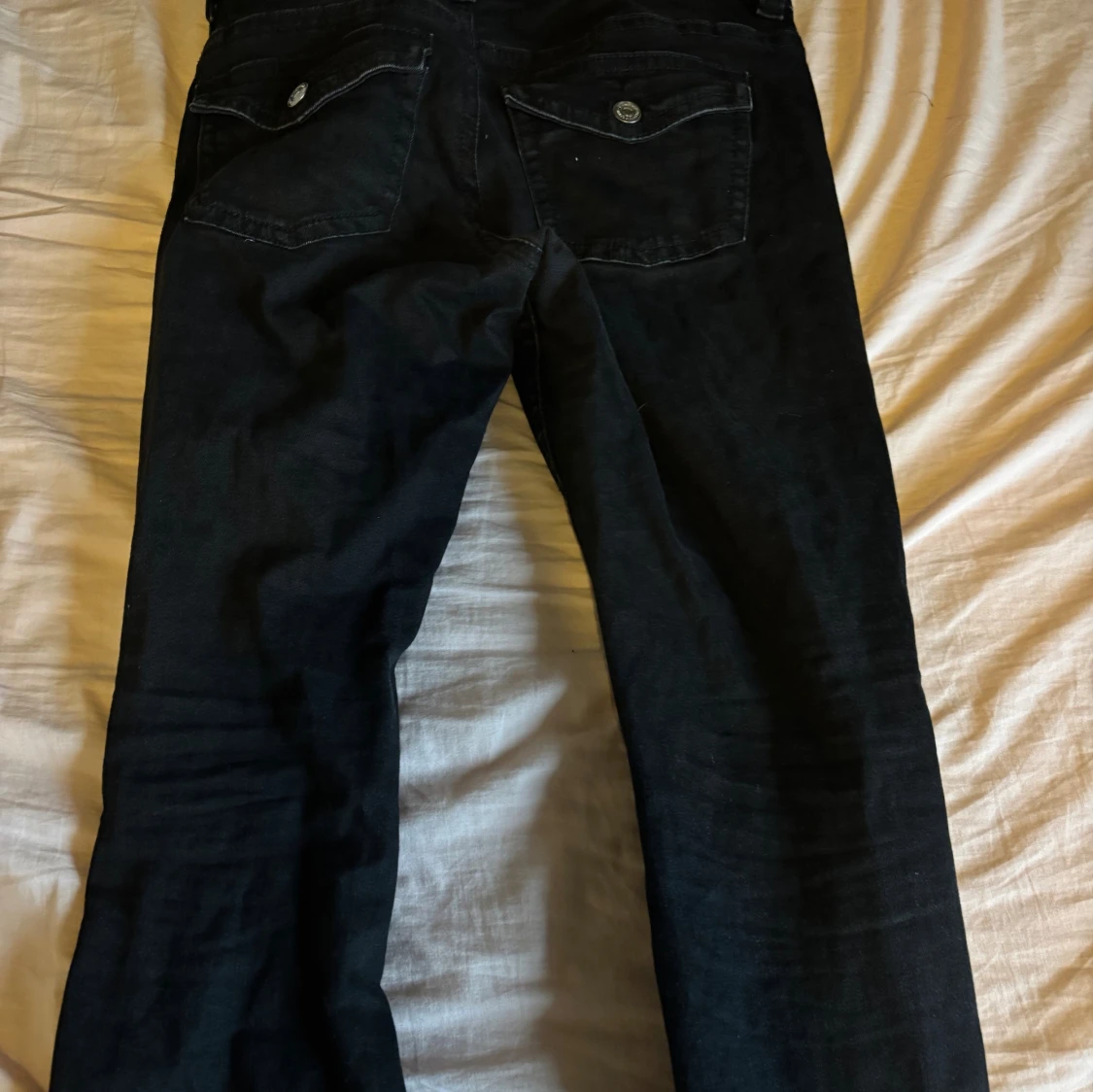 Svarta bootcut jeans från Gina med låg midja. Snygga silvriga knappar på baksidan. Behöver tyvärr sälja mina favorit byxor för att dom blivit förstora💞