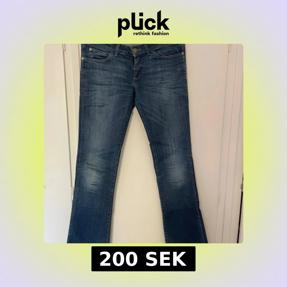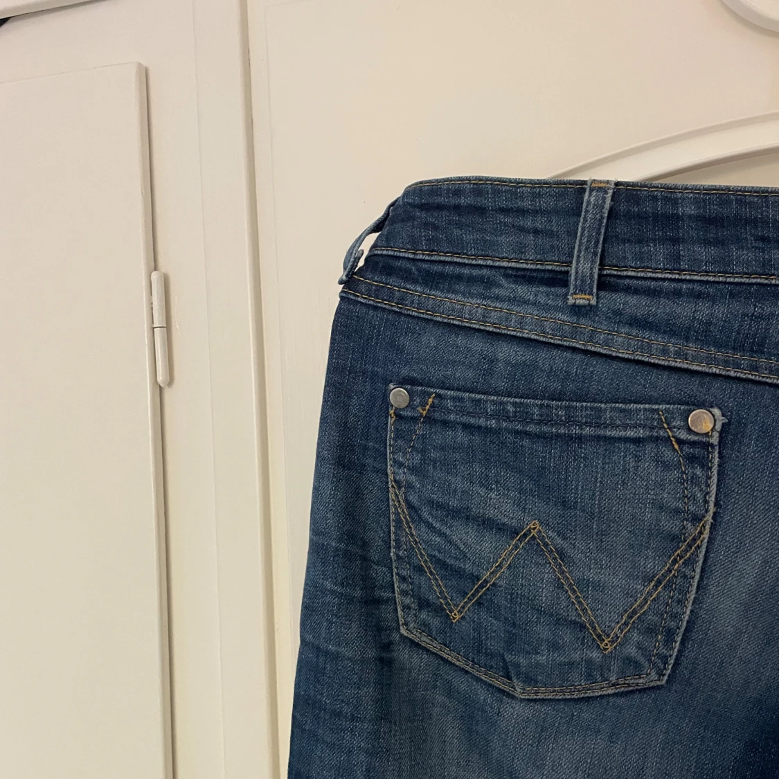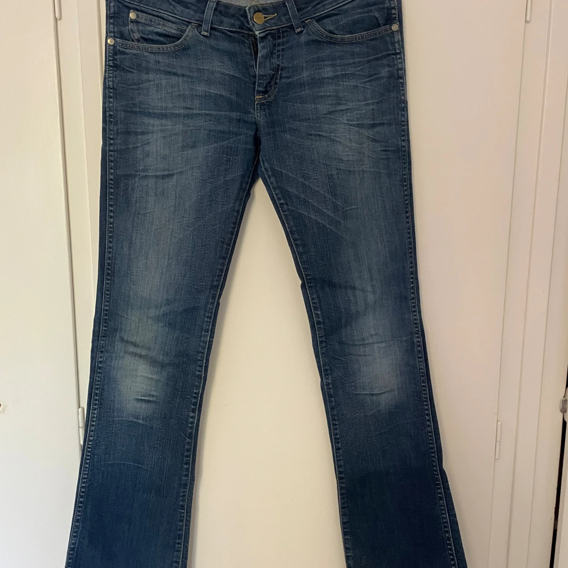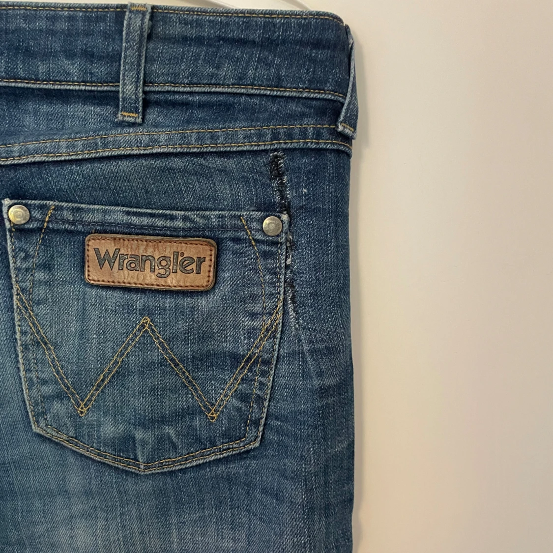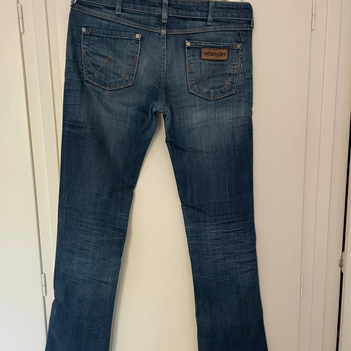 Snygga blå jeans från Wrangler med klassisk bootcut-modell och slitna detaljer. Dom är långa och passar mig perfekt, (jag är 180) Det har en liten söm bredvid den högra bakfickan (se bild 4), men det är inget som man lägger märke till. Skriv vid frågor, exakta mått eller fler bilder💕