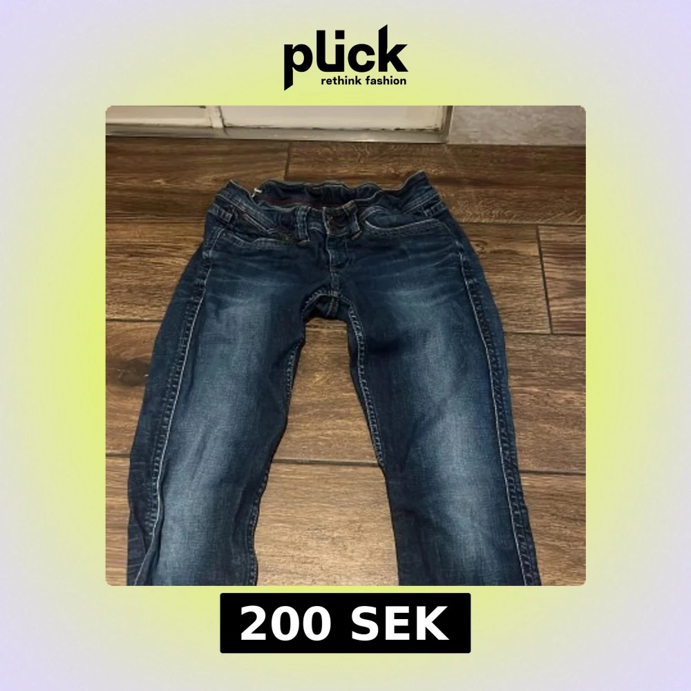 Säljer ett par mörkblå jeansbyxor med snygga slitningar och broderade detaljer på bakfickorna. Klassisk femficksmodell med dragkedja och knapp framtill. Perfekta till vardags för en avslappnad stil.