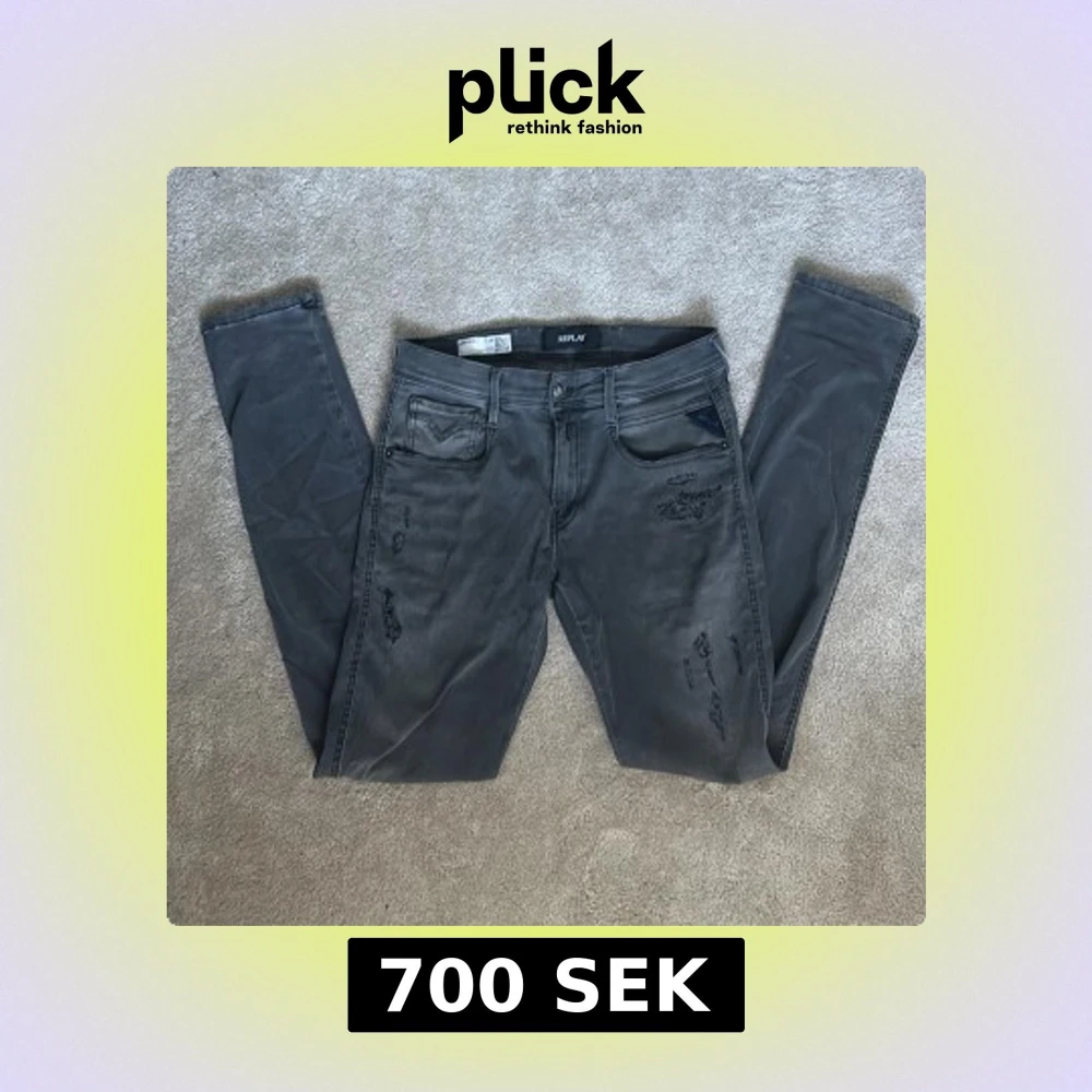 Jag säljer ett par riktigt feta gråa replay anbass jeans med riktigt fräscha slitningar som verkligen lyfter plagget. Jeansen är i en lite mörkare grå ton. Jag säljer jeansen för att de helt enkelt inte kommer till så stor användning längre. Jeansen är i storlek 29 alltså Waist 29 och sen även length 34. De är lite för långa på mig men med tanke på att de är långa så kompenserar det för att de är lite smalare så att om man drar upp de så sitter de helt perfekt! Pris kan eventuellt diskuteras.