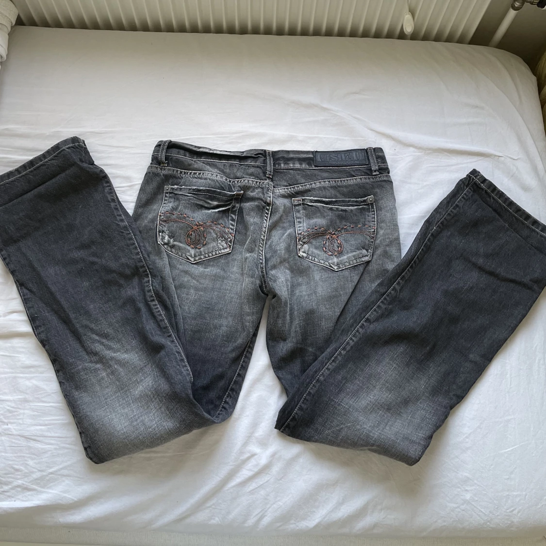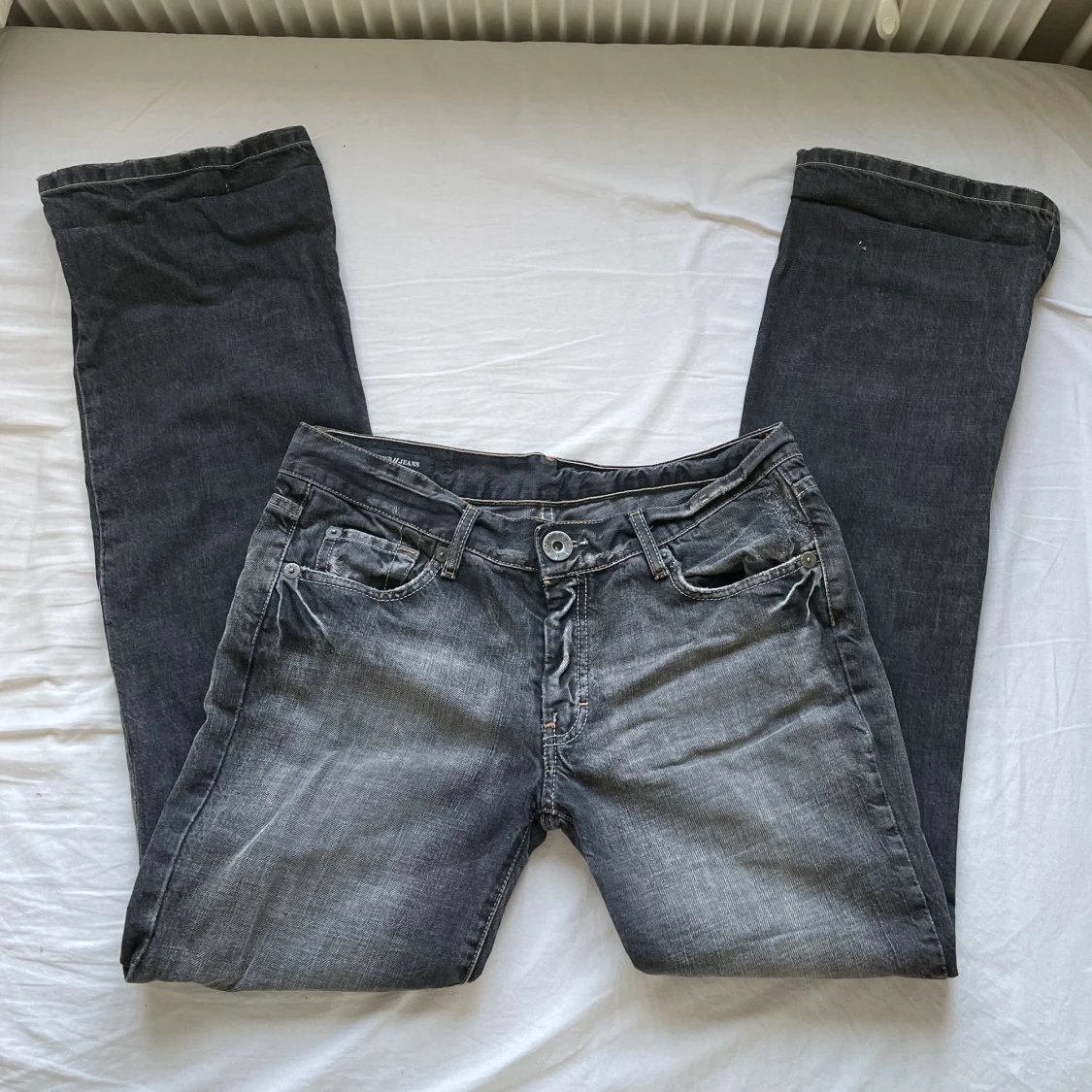 Grå lågmidjade bootcut jeans. Innerbenslängd: 85 cm, midja: ca 80 cm