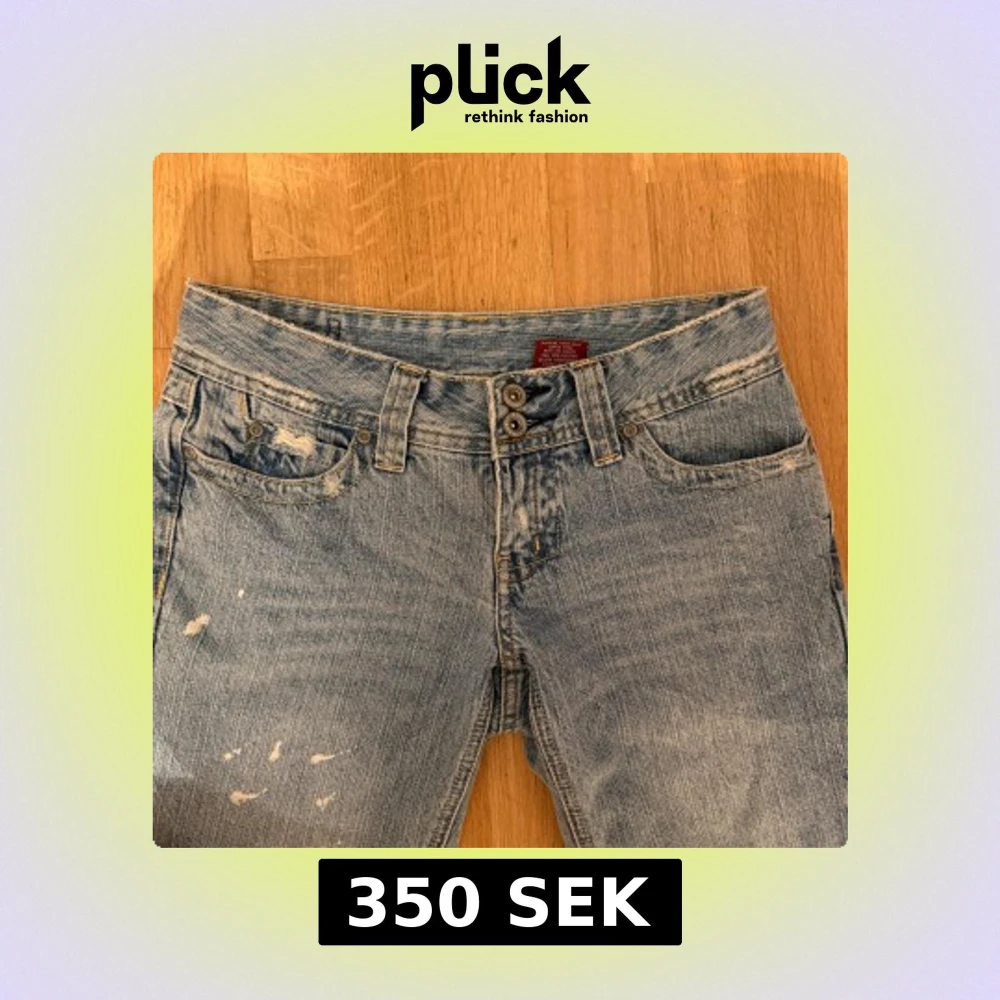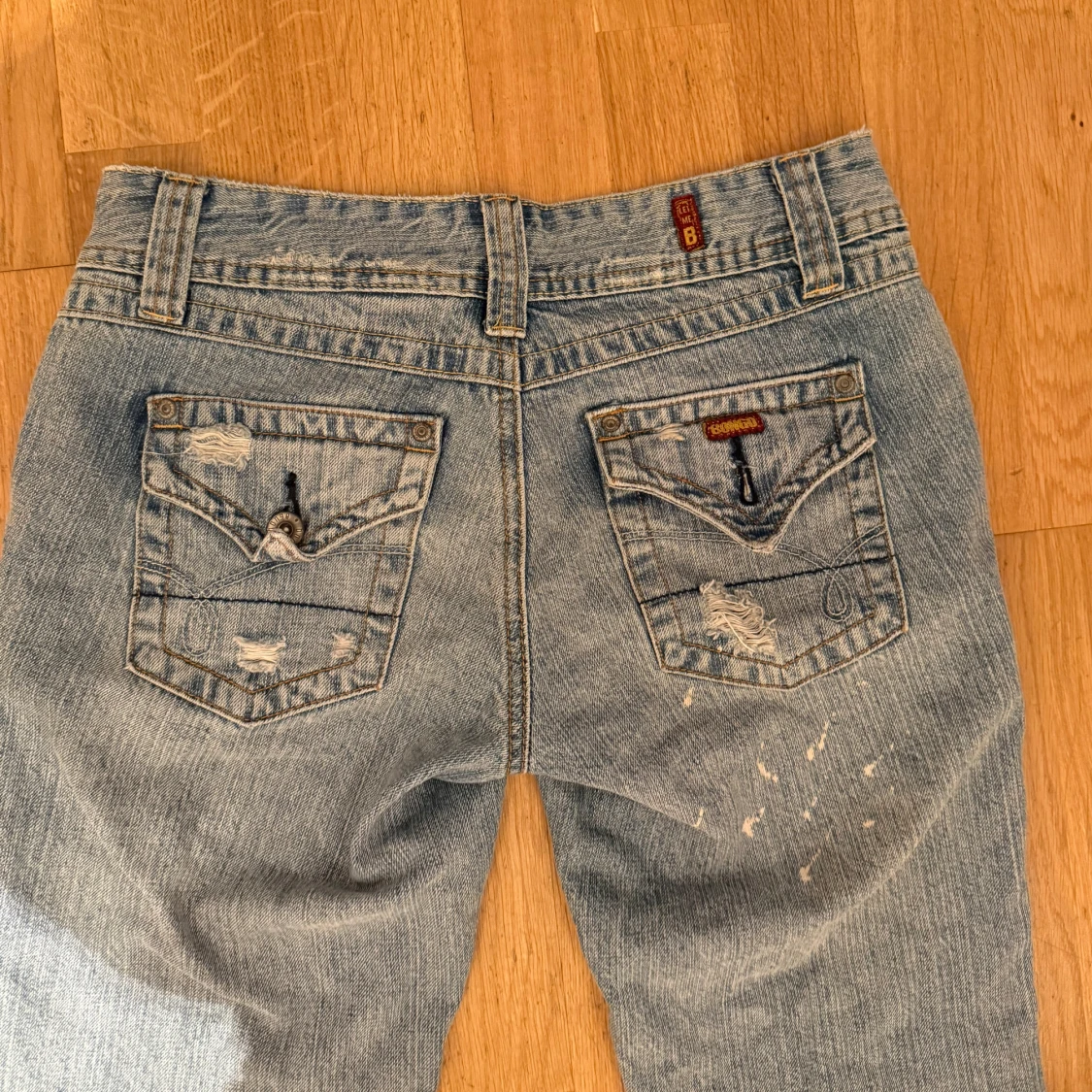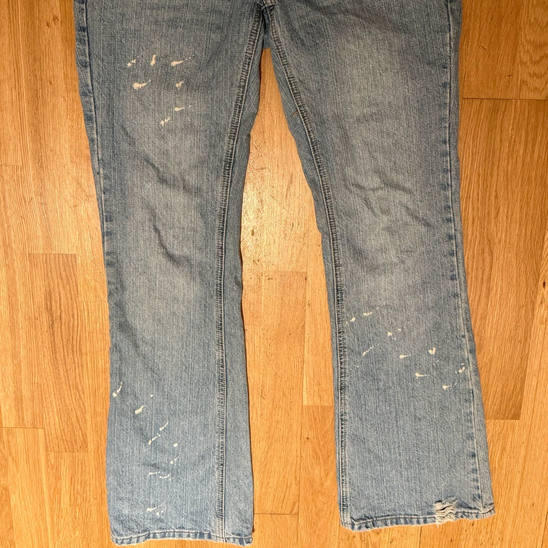 Ljusblå jeans med slitningar och distressed detaljer, dubbla knappar i midjan och bakfickor med broderier. Klassisk femficksmodell i bomull med bootcut-ben och cool vintagekänsla. Kan tyvärr inte visas på för att de är försmå.