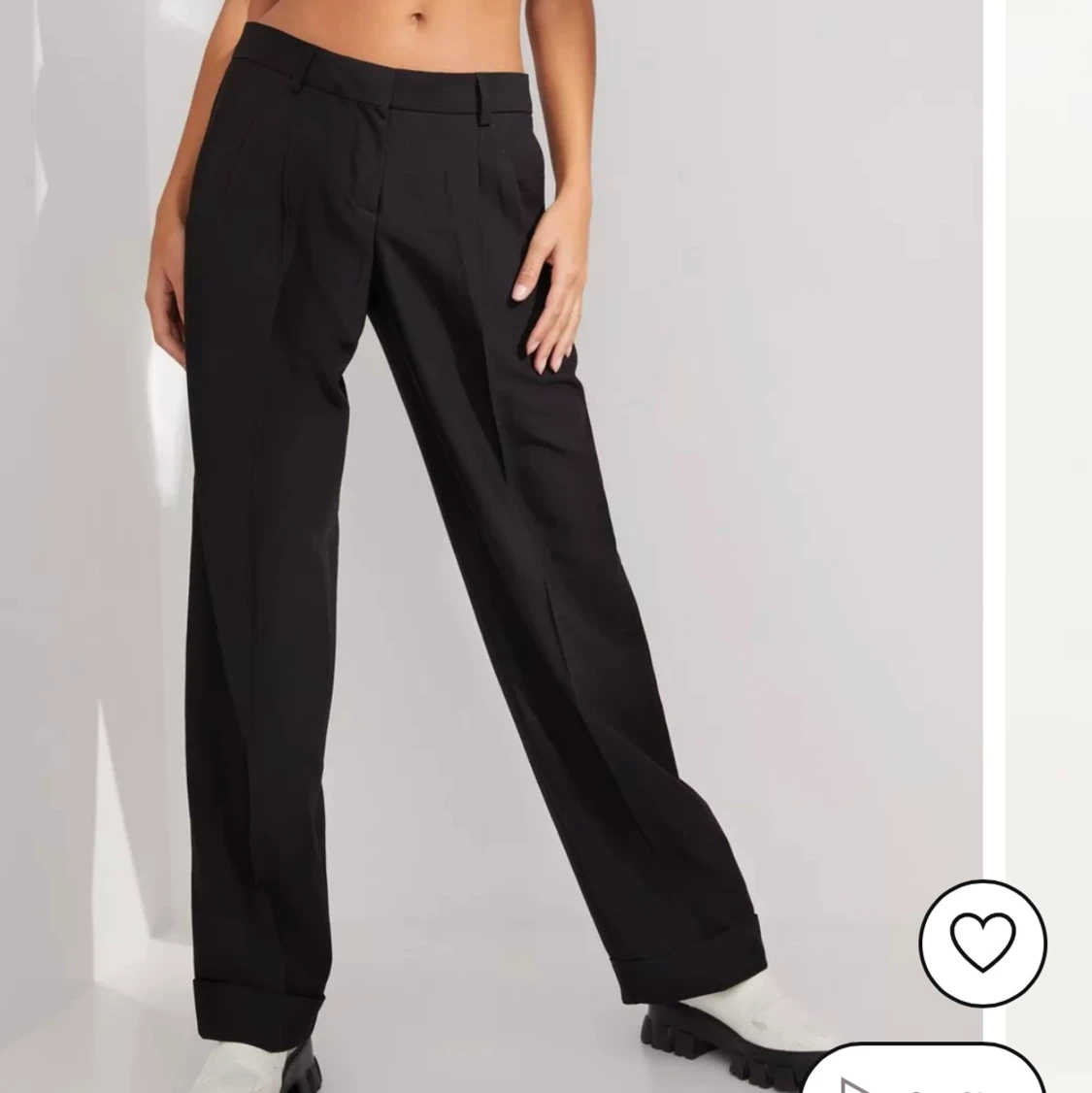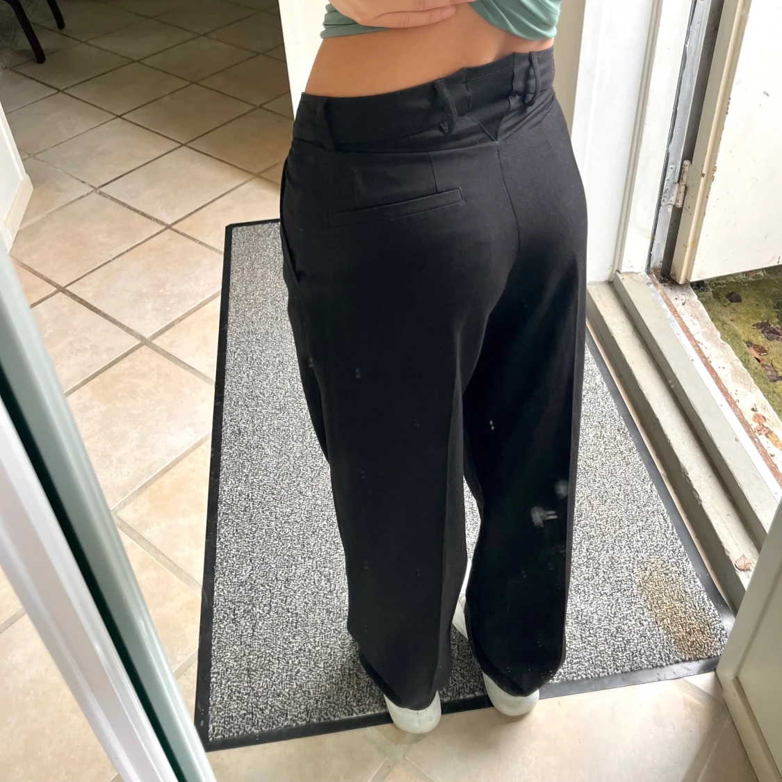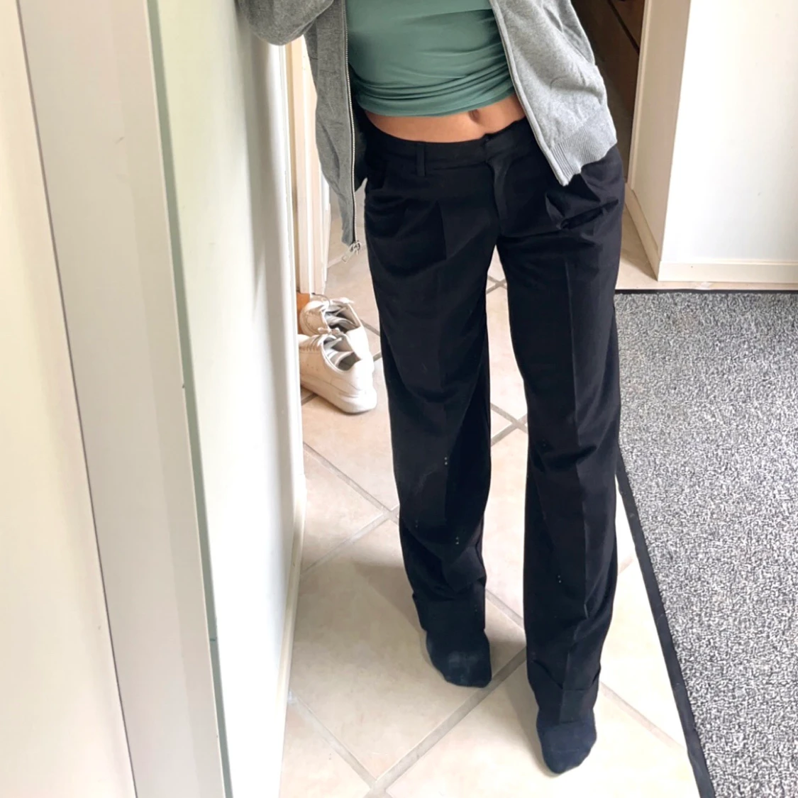 Svarta perfekta low waist kostymbyxor från jjxx. Storlek W24 L32. Jag som är 164 kliver på dom ganska mycket utan skor. Har sytt fast en kil i midjan bak i stretch (andra bilden) så dom sitter längre ner på höften, inget man tänker på när dom sitter på!