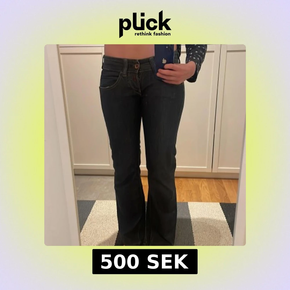Säljer ett par mörkblå jeans med bootcut passform och låg midja. Jeansen har klassiska fickor fram och bak, samt snygga kontrastsömmar. Perfekta för dig som gillar en retroinspirerad stil. ‼️Jag på bilden har midjemått 82 och är typ 175, de går ner till fötterna‼️