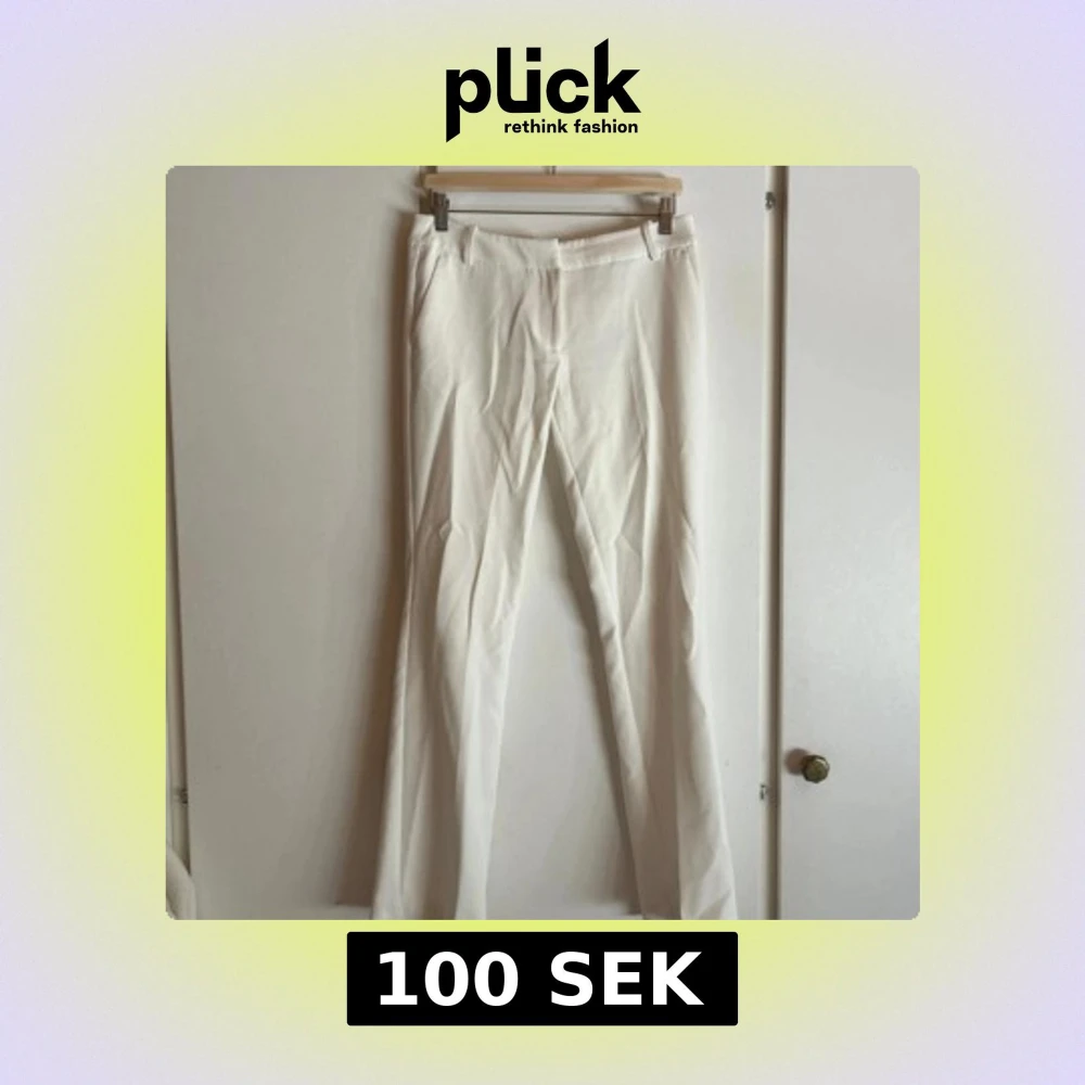 Snygga vita kostymbyxor med raka ben och diskreta fickor bak. Byxorna har bälteshällor och klassisk passform, perfekta för en clean och stilren look. Materialet känns mjukt och har en lätt glans, vilket ger en fräsch vibe.