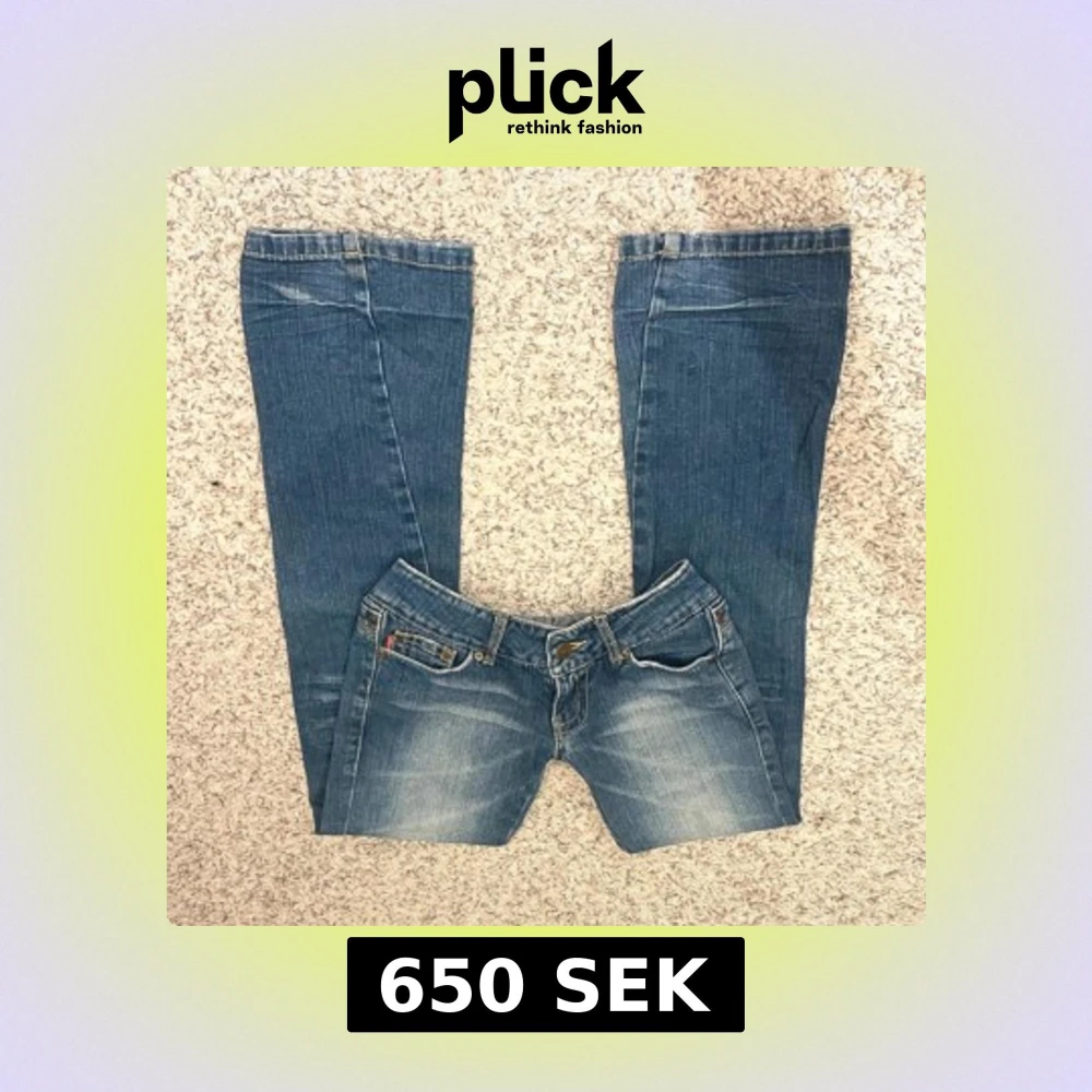 Snygga blå bootcut jeans med låg midja och ljusa slitningar. Innerbenslängd: 80 cm, midjemått: 35 cm🩷