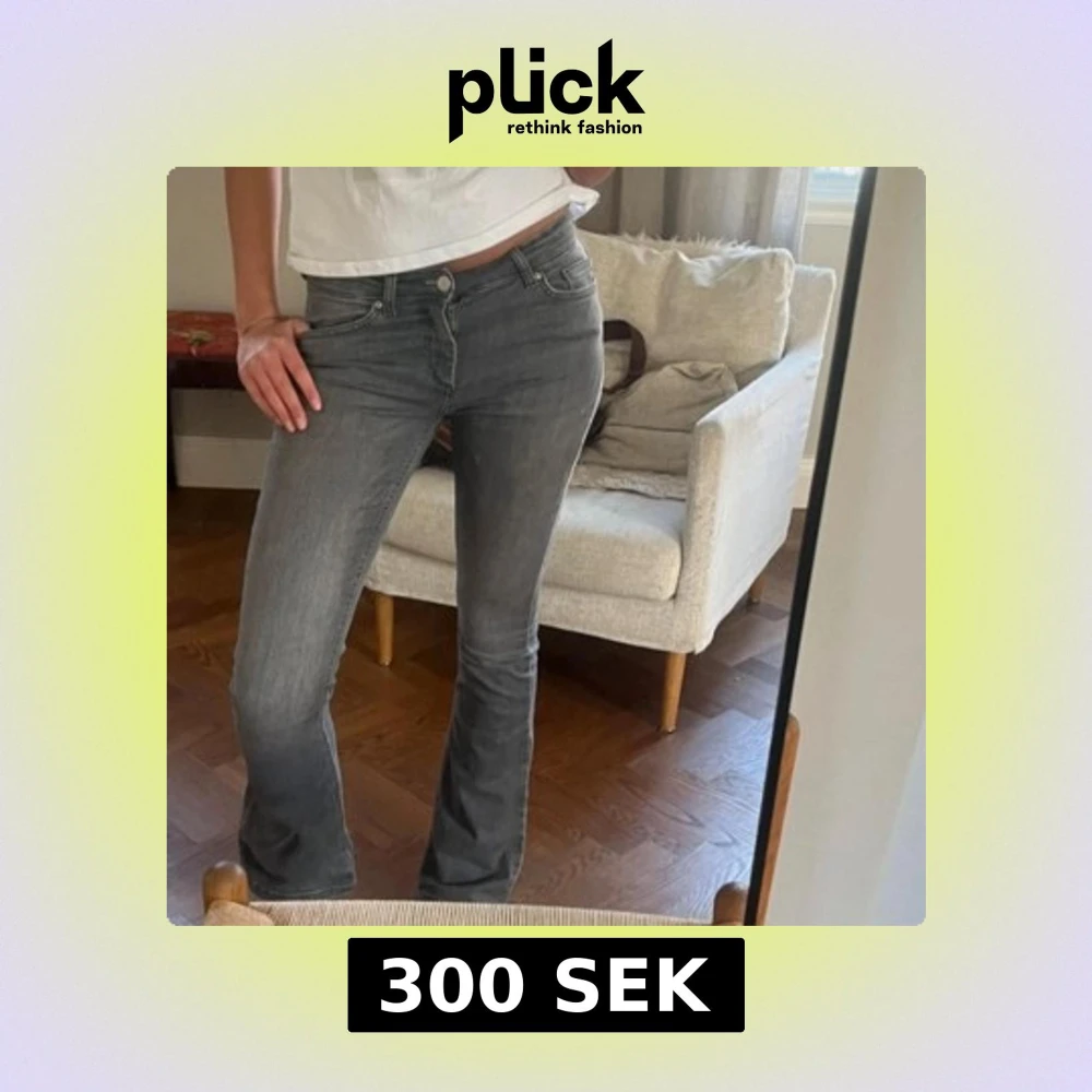Snygga grå bootcut jeans med en klassisk femficksdesign. De har en smickrande passform och är perfekta för en avslappnad stil. Storlek S och längd 32