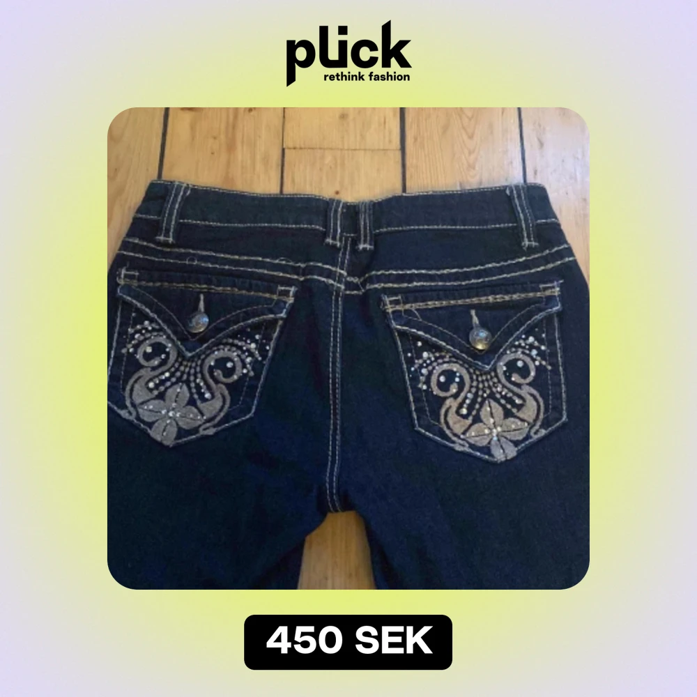 Jättesnygga lowwaist bootcut jeans med super snygga detaljer på fickorna och sömmarna!! Innerbenslängd är 79cm, midjemåttet är 37 cm tvärs över och det är 20 cm från skrevet upp!