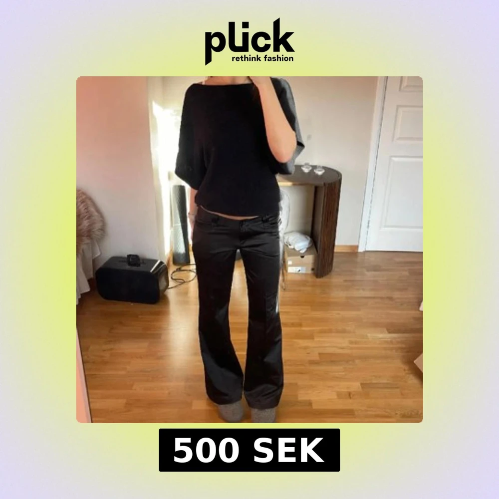 Säljer ett par svarta bootcut-byxor med låg midja. Super snygga och unika!💙Lånade bilder då byxorna är för stora på mig☺️aldrig använda med prislapp kvar. Midjemått: 82cm Innerben: 85cm