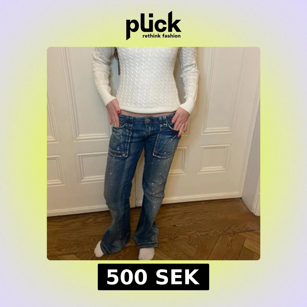 Snygga blå jeans med unika stora fickor framtill och coola slitningar. Byxorna har en bootcut-stil och är dekorerade med vita färgstänk för en trendig look. Perfekta för en avslappnad stil. Köpta second hand!