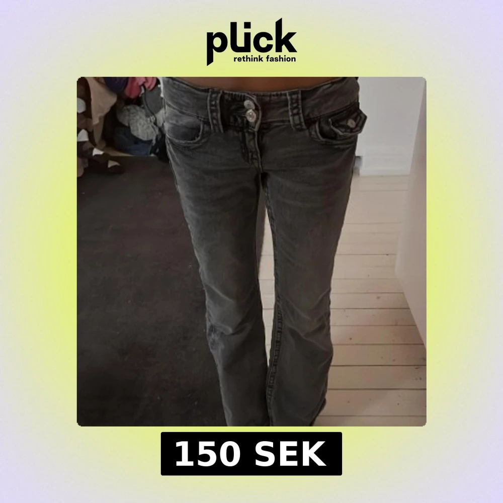 Snygga grå jeans med låg midja och bootcut-stil. De har dubbla knappar framtill. ❤️