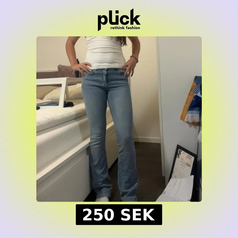 Snygga ljusblå jeans med bootcut-modell och klassisk femficksdesign. Jeansen har hög midja och är tillverkade i stretchigt denim som sitter tajt över låren och släpper ut vid vaden. Perfekta för dig som gillar en retroinspirerad look.