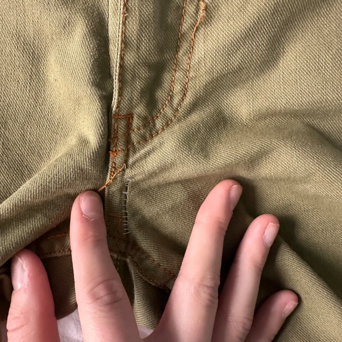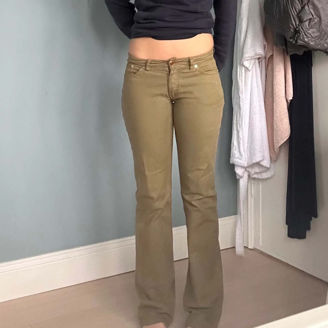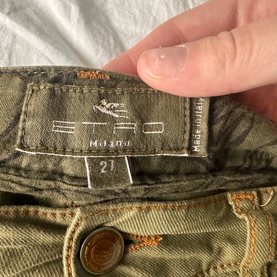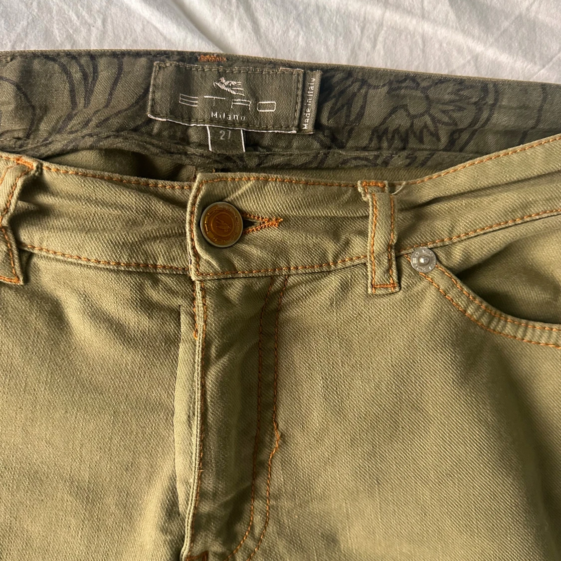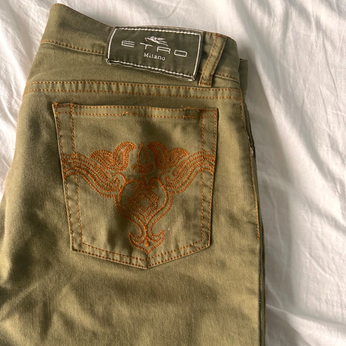 Snygga khakifärgade bootcut-byxor från Etro Milano med orange broderi på bakfickan och coola kontrastsömmar. Klassisk femficksmodell med låg midja och knappstängning. Tillverkade i bomull för en skön känsla och stilren look. Inga defekter alls mer en ett lagat hål under gylfen! Det är inget som syns