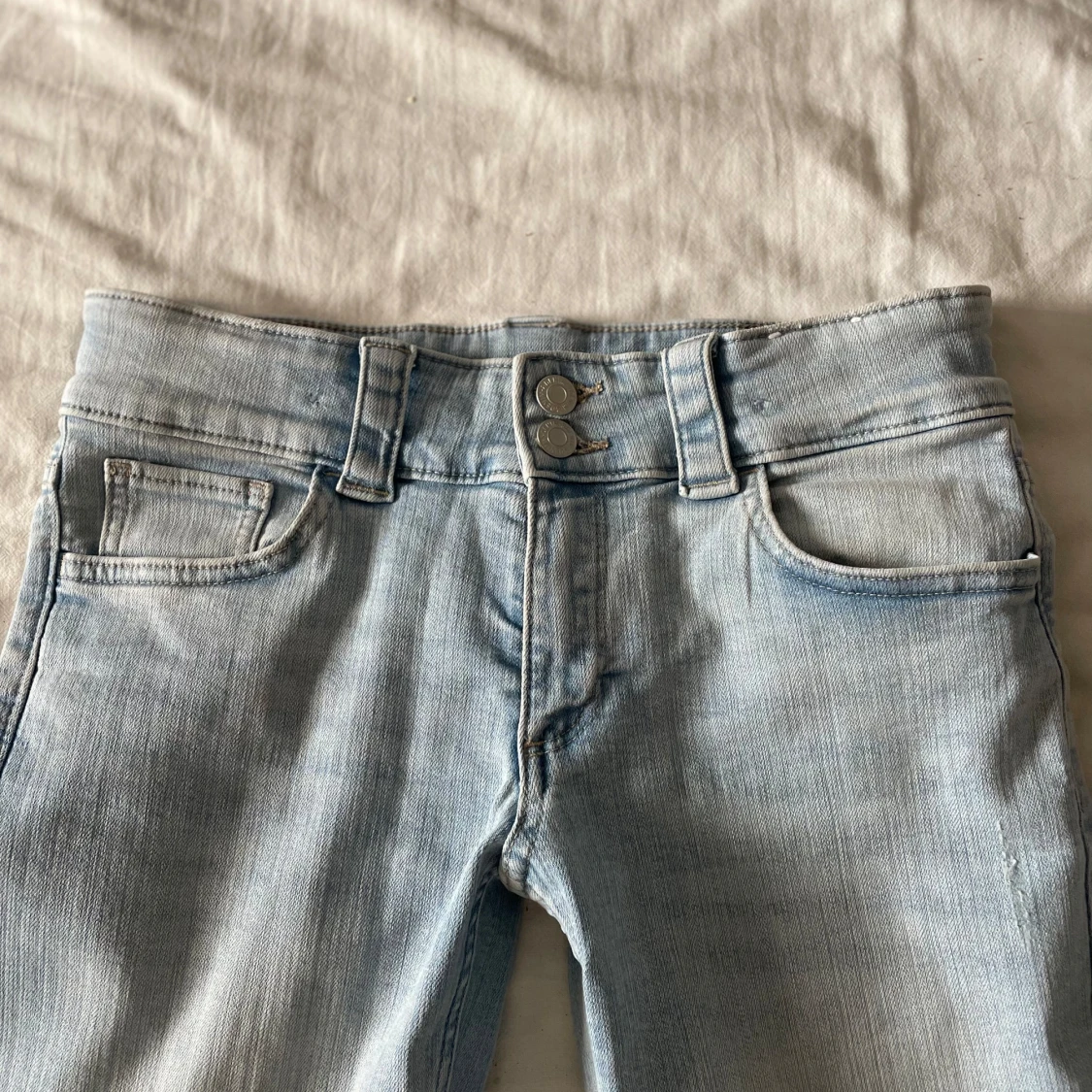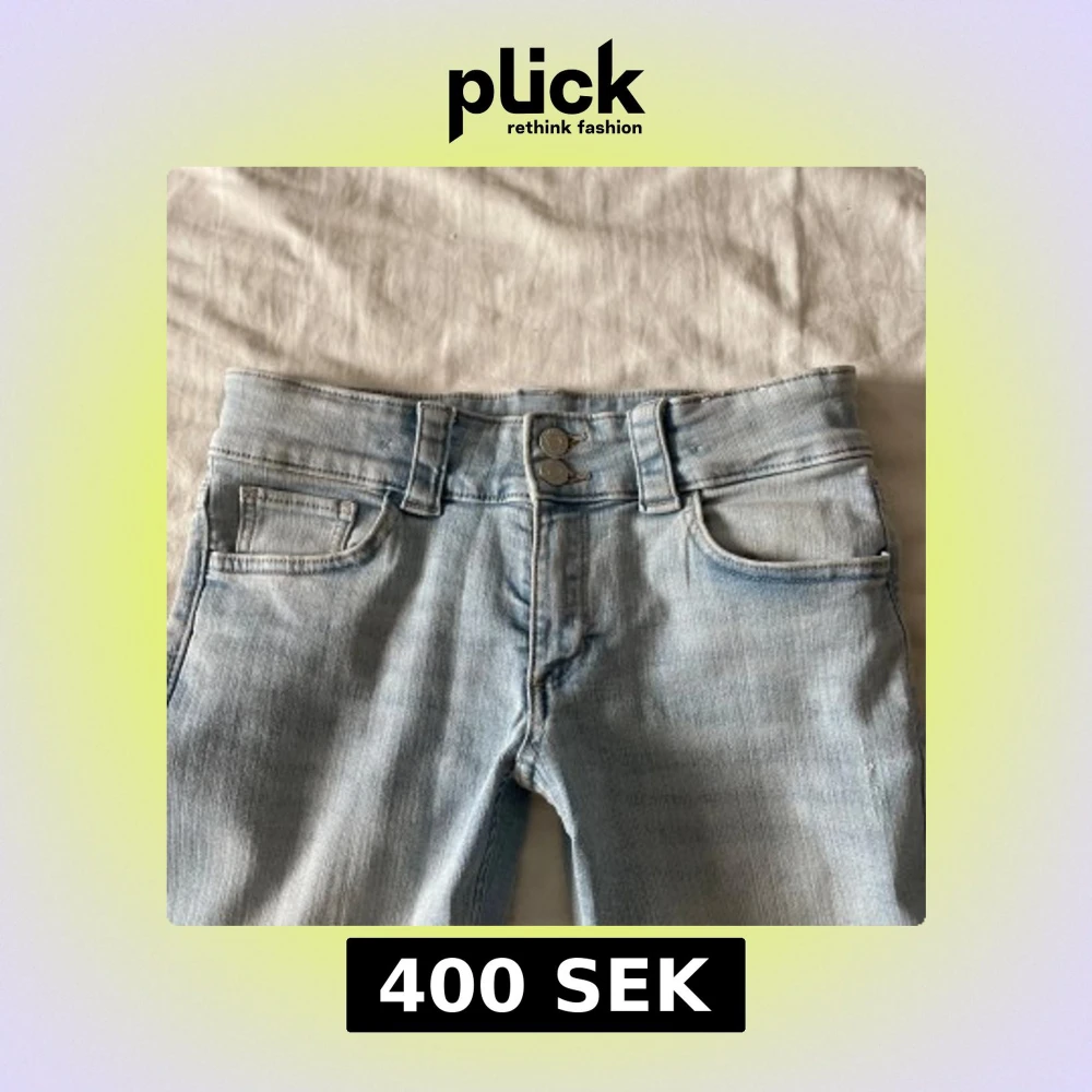 super snygga ljusblåa jeans som är low waist och har stretch, köpta på plick men aldrig använt då dom är för stora för mig.
