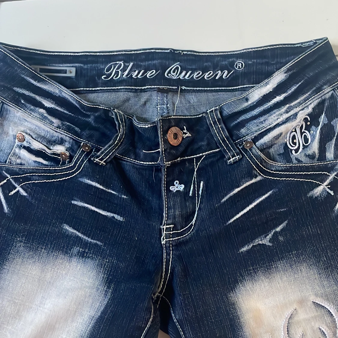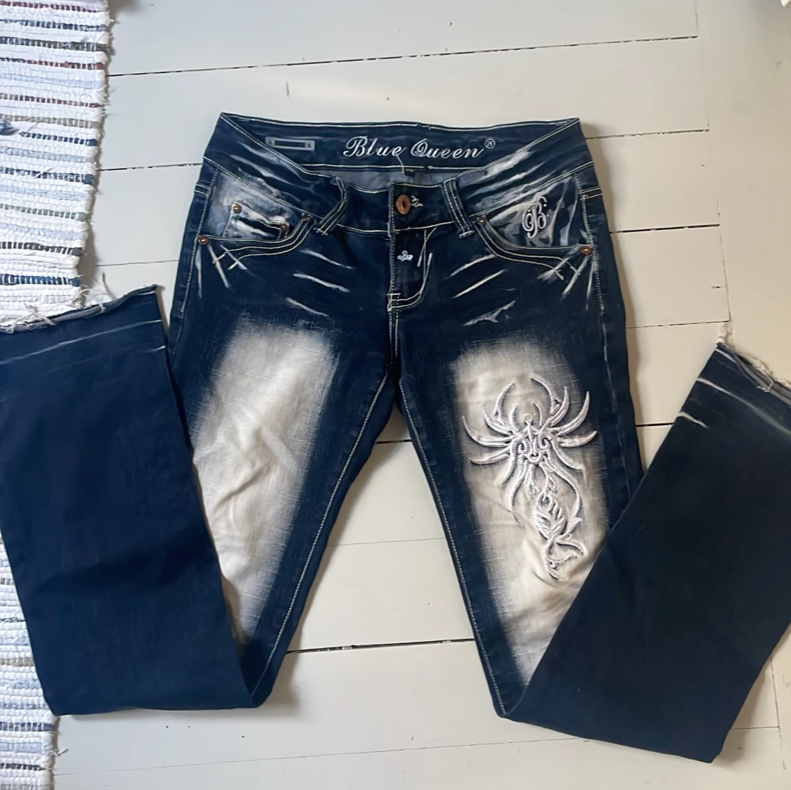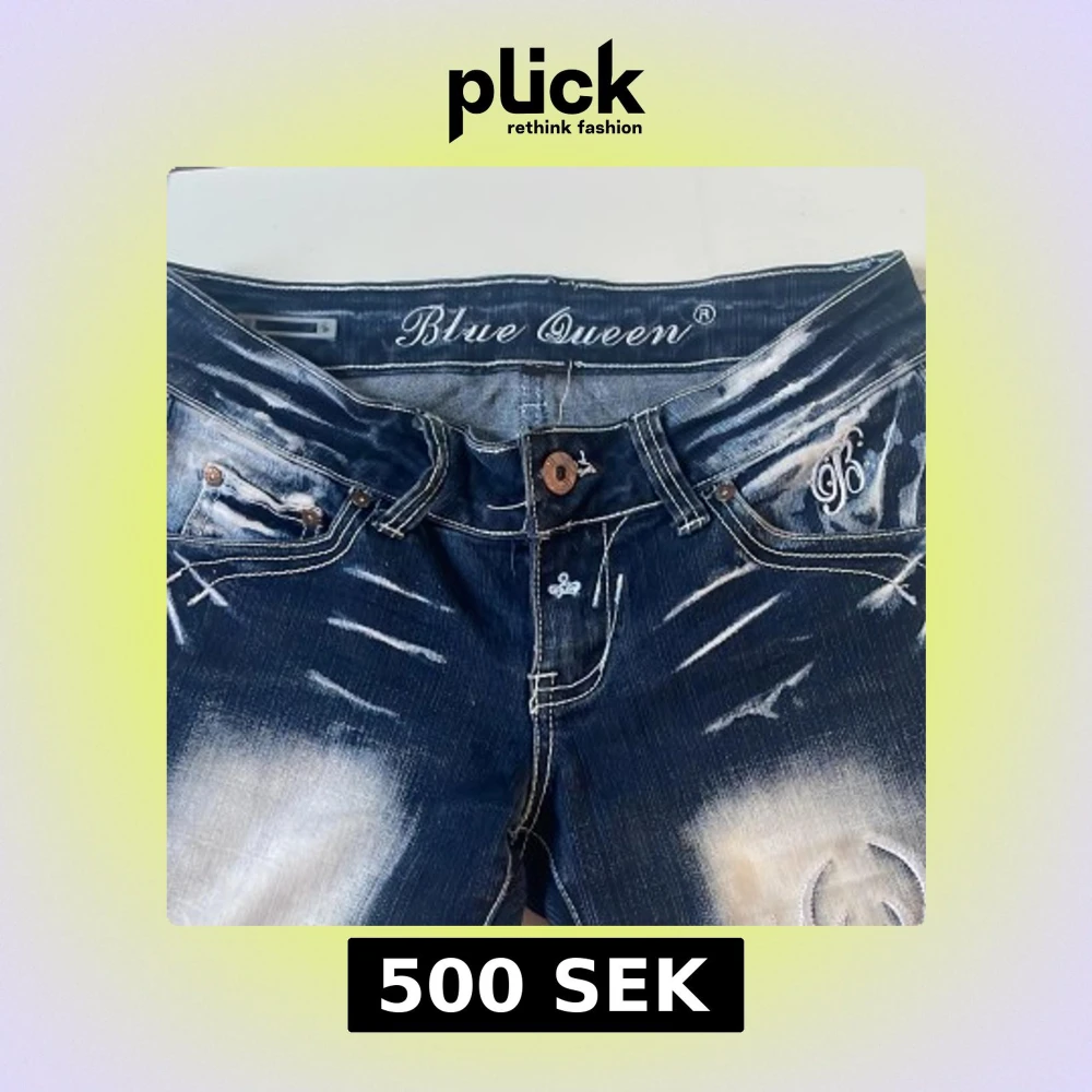 Unika blå jeans från Blue Queen ★ köpta från plick för 900kr 🩷 Stretchigt material, sitter skönt. Knappen sitter lite löst men fungerar fortfarande. Innerbenslängd: 80cm Midjemått tvärs över: 26cm