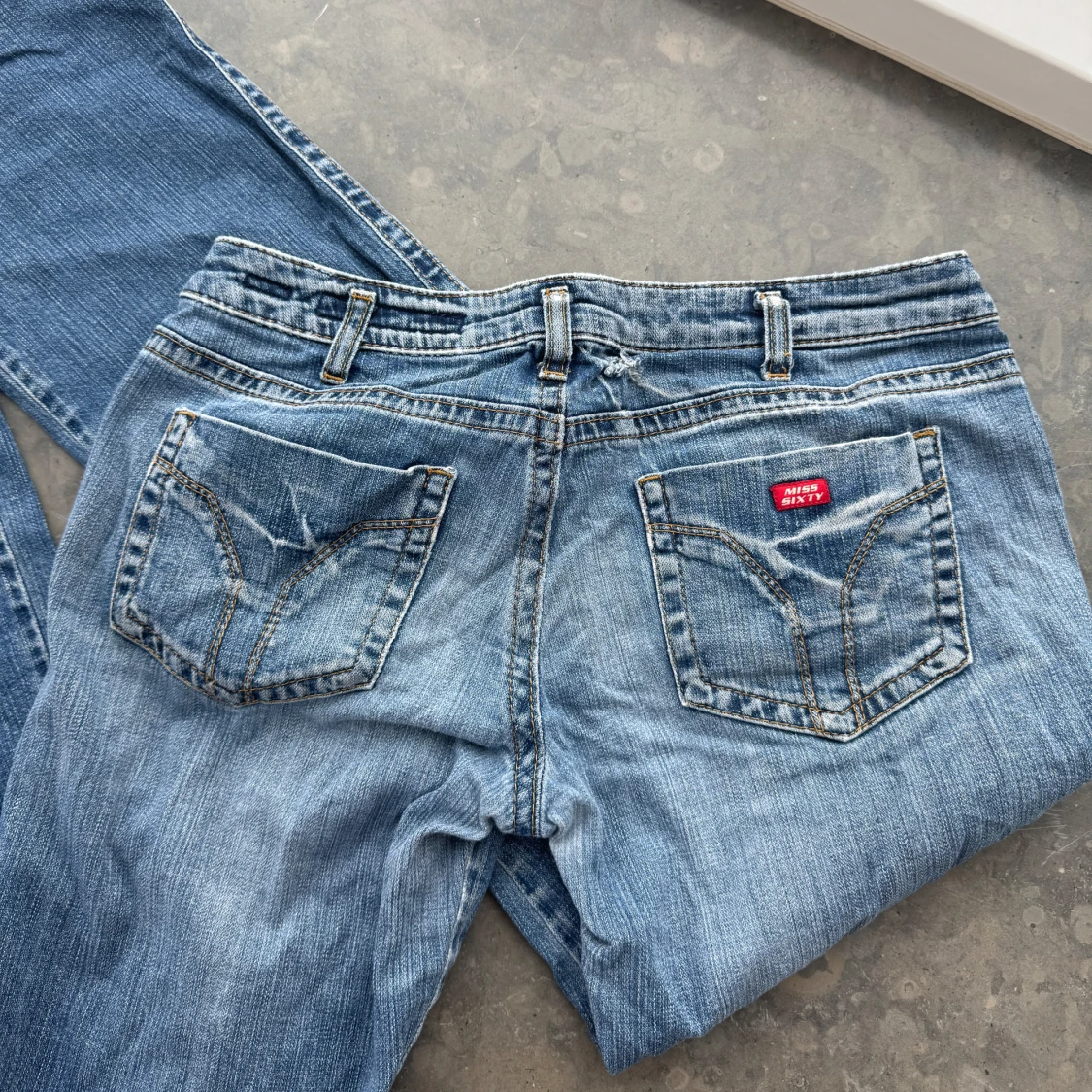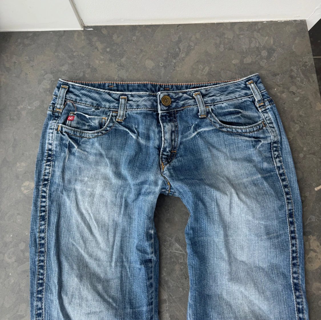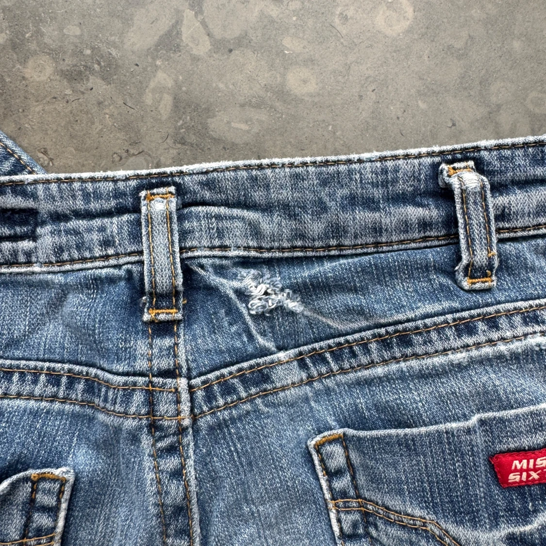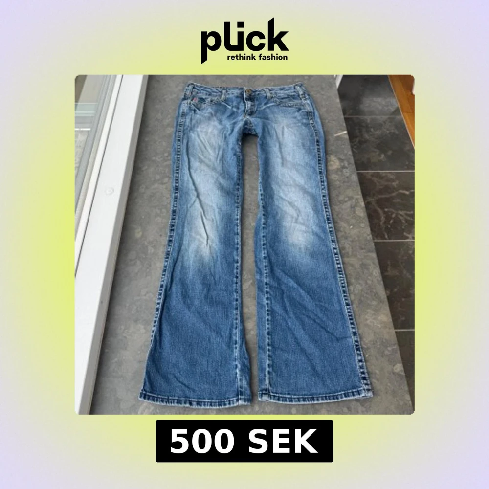 Endast intressekoll‼️Midjemått tvärsöver: 41,5cm Midjehöjd: 20cm Inerbens längd: 79cm. Jeans är välanvända och tyget är slitet och tunt mellan benen, men fortfarande i ganska bra skick. Finns ett litet hål, se sista bild💕