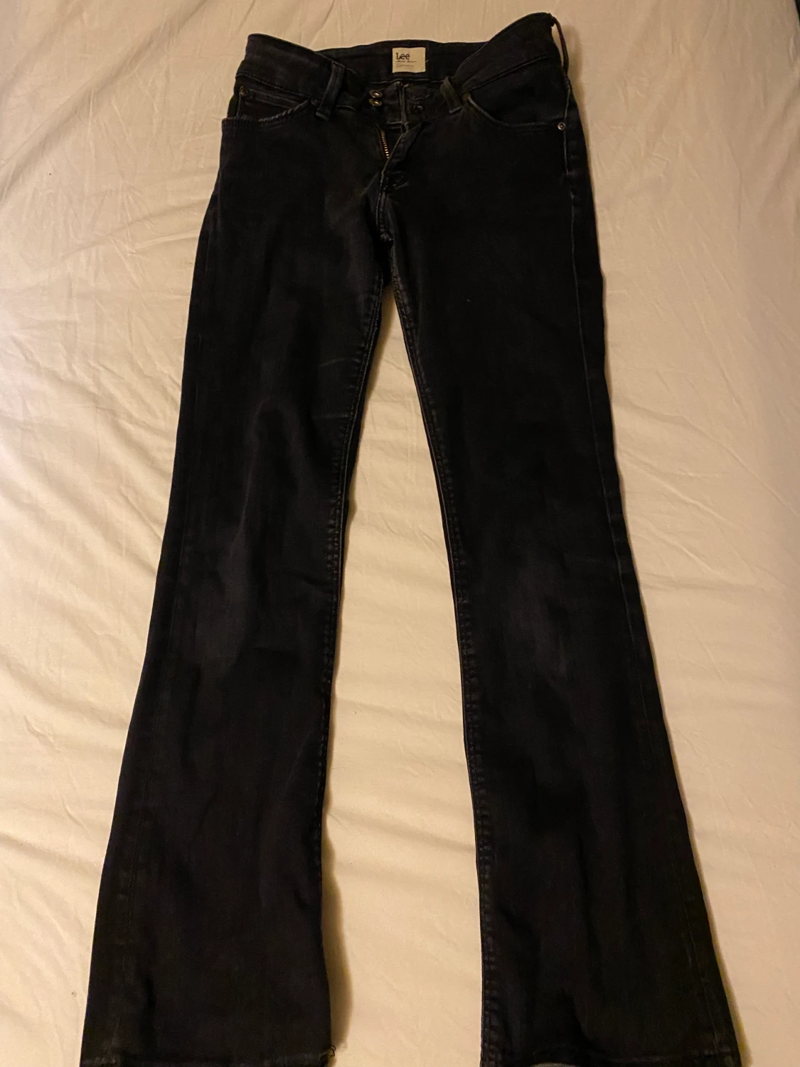 Säljer dessa svarta low waist bootcut jeansen från Lee. Säljer på grund av att dom e för små på mig , passar någon som e ungefär 155cm lång.