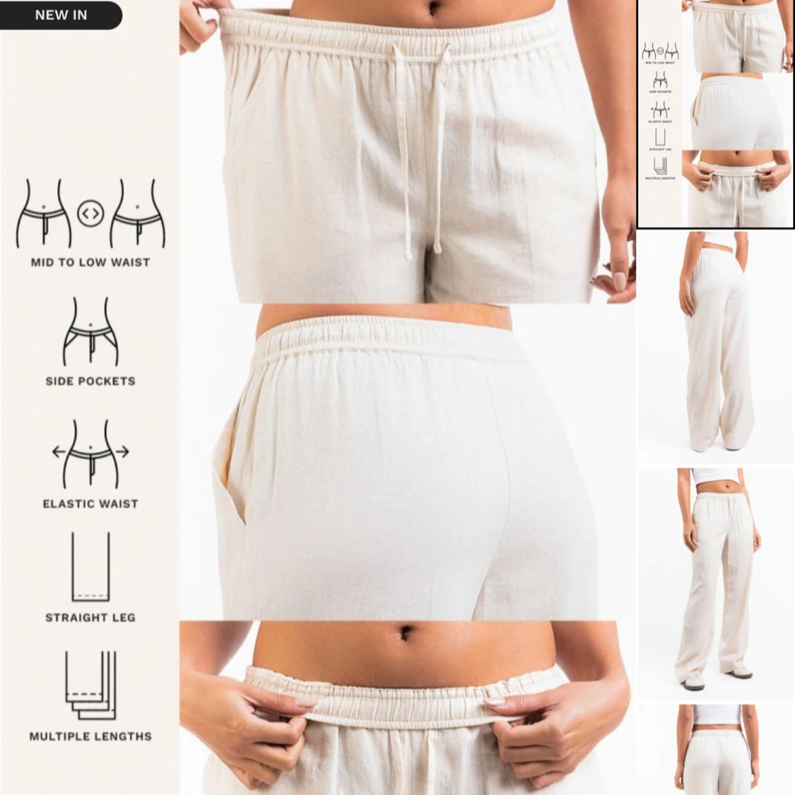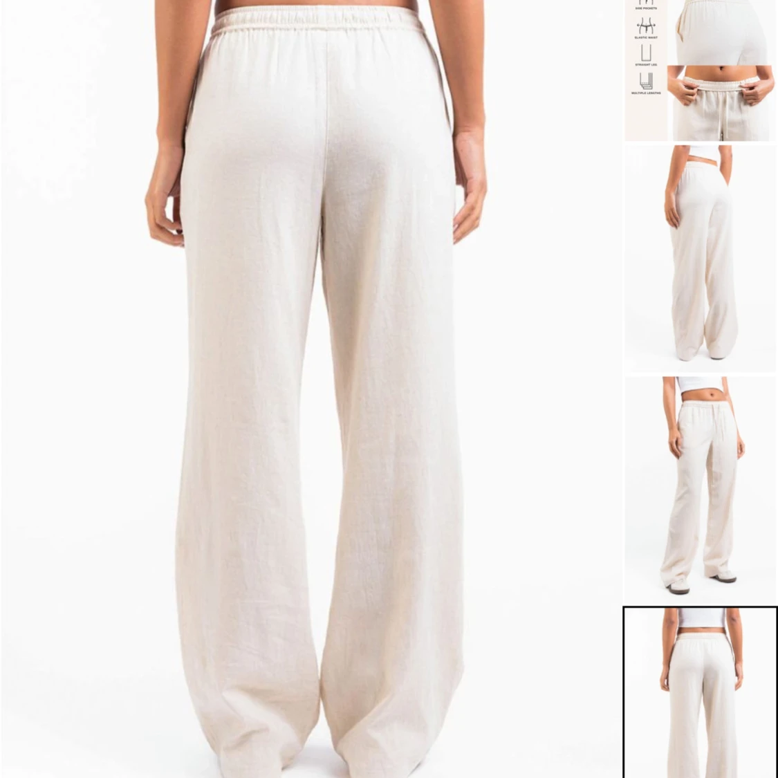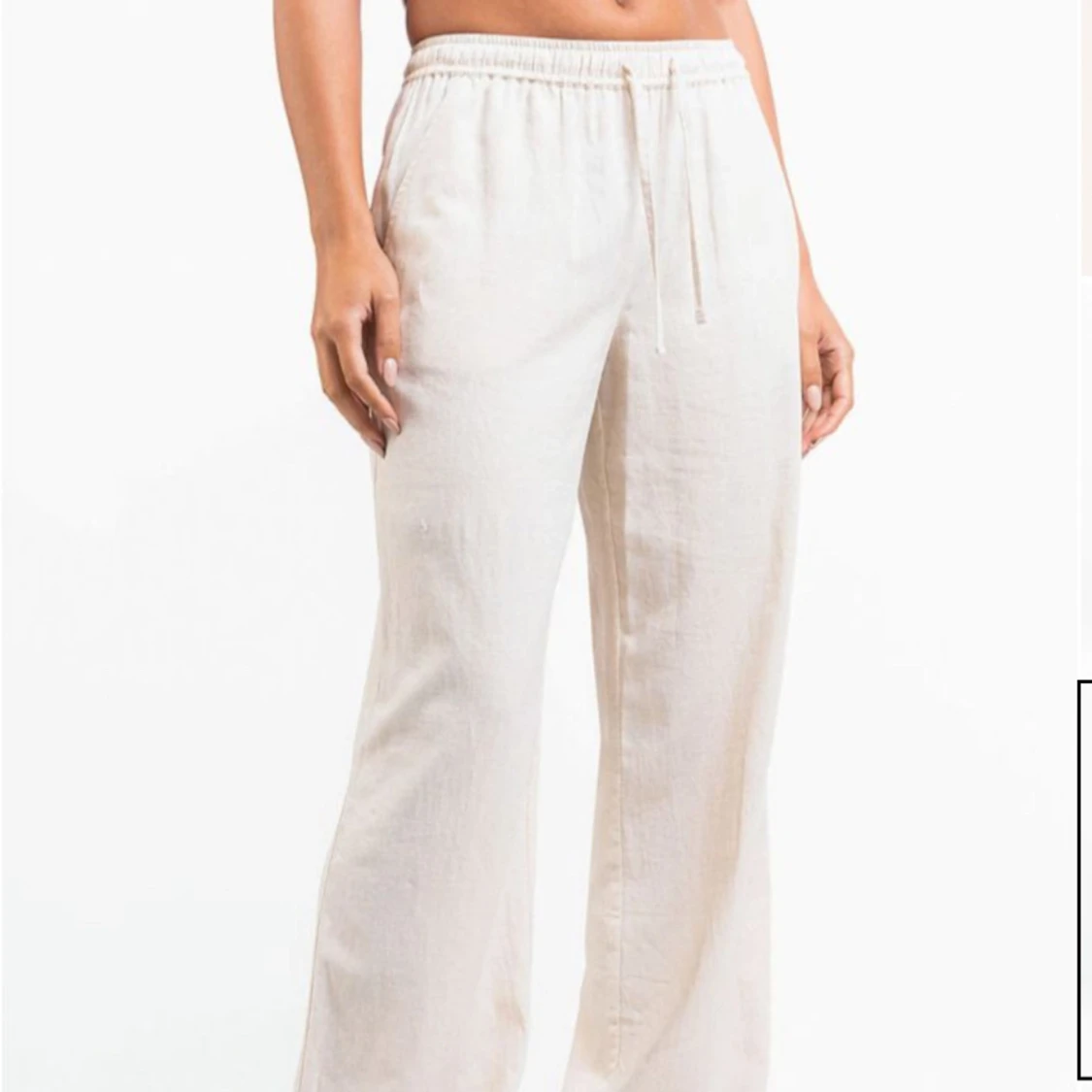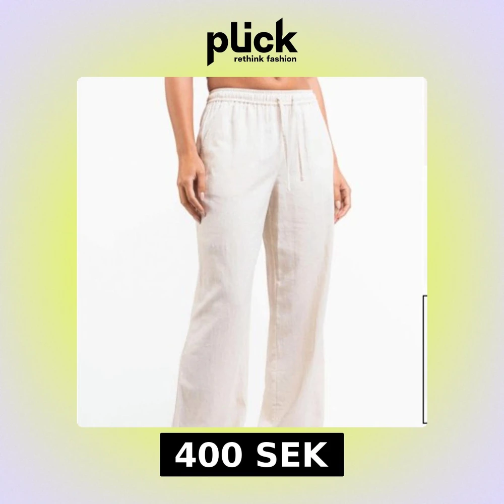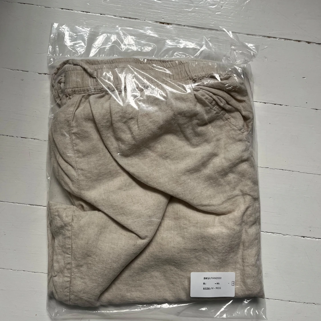 Snygga beiga linnebyxor med rak och loose passform från Madlady. Byxorna har elastisk midja med snörning och sidofickor. Perfekta för chill dagar eller när du vill ha en avslappnad look. Lätta och luftiga i materialet, passar grymt till sommaren. I helt oöppnad förpackning så är aldrig använda. I regular längd🩷