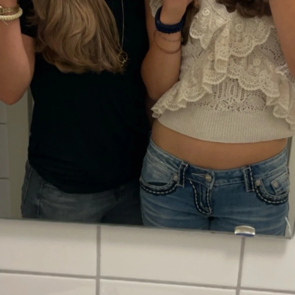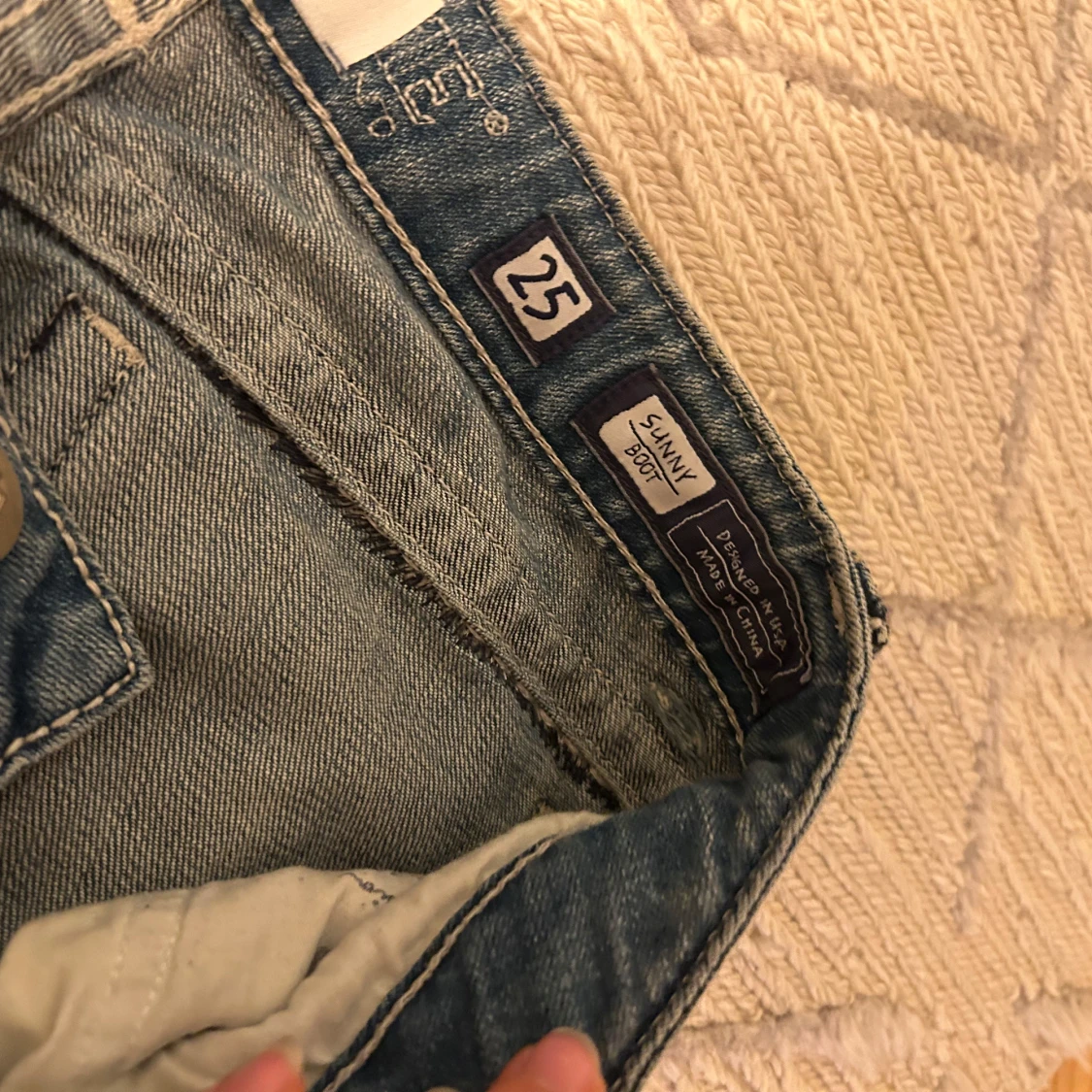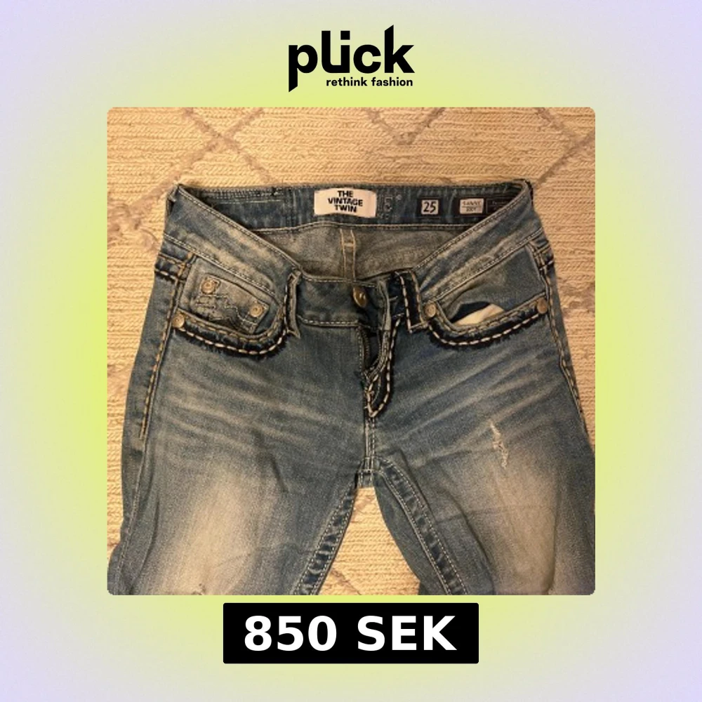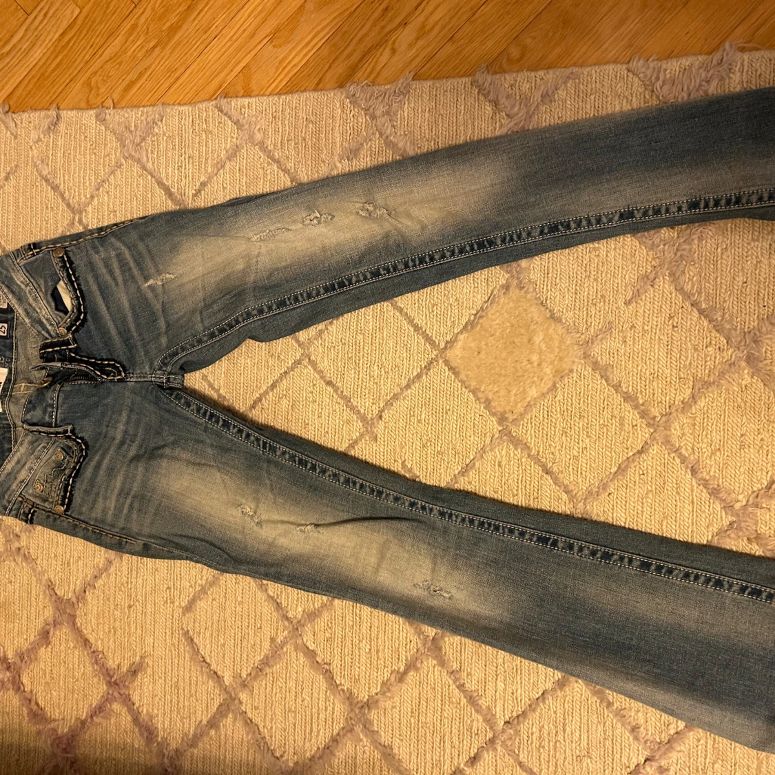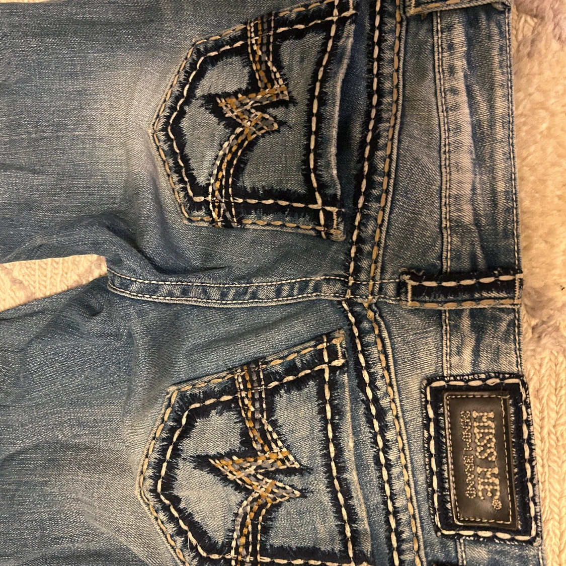 Säljer ett par ljusblå jeans från Miss Me med bootcut-modell. Jeansen har slitna detaljer, kontrastsömmar och snygga broderade bakfickor. Köpta i New York för 250💙midjemått:31 cm tvärs över💙innerbenslängd:81cm