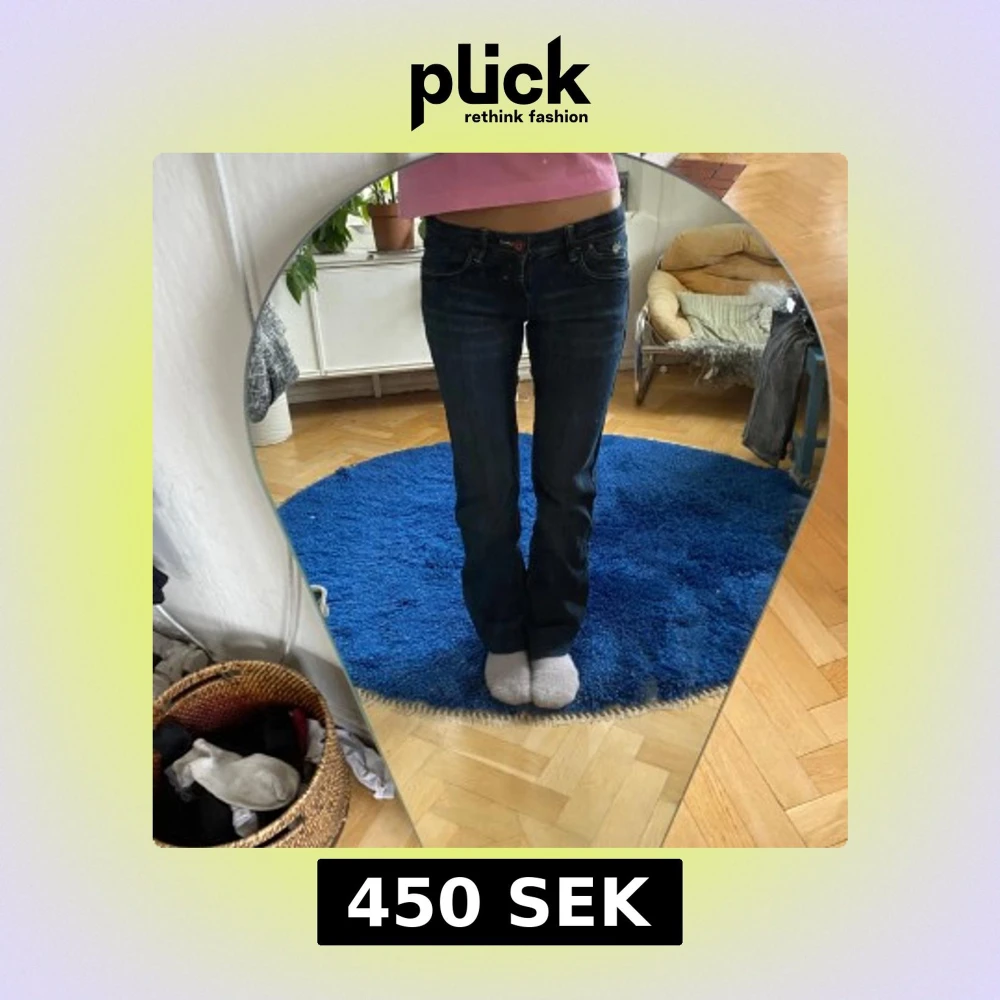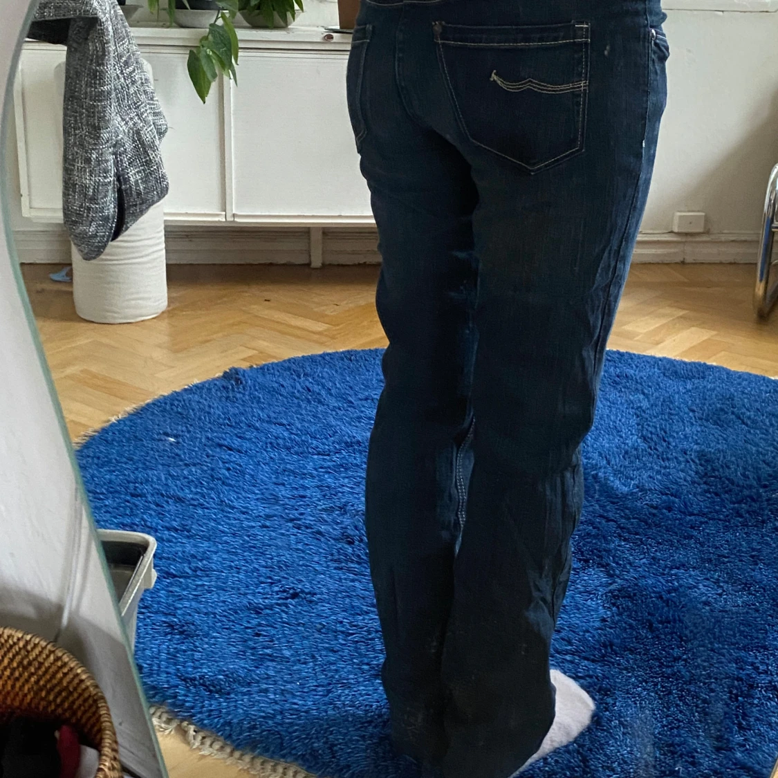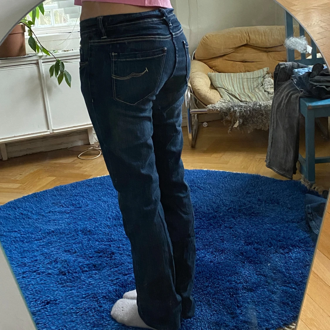 Säljer ett par lowwaist mörkblå bootcut jeans med as snyggt broderi på bakfickorna och unik röd knapp vid gylfen. Tycker själv att jeansen är supersnygga men har redan ett par liknande så därav säljer jag de!.