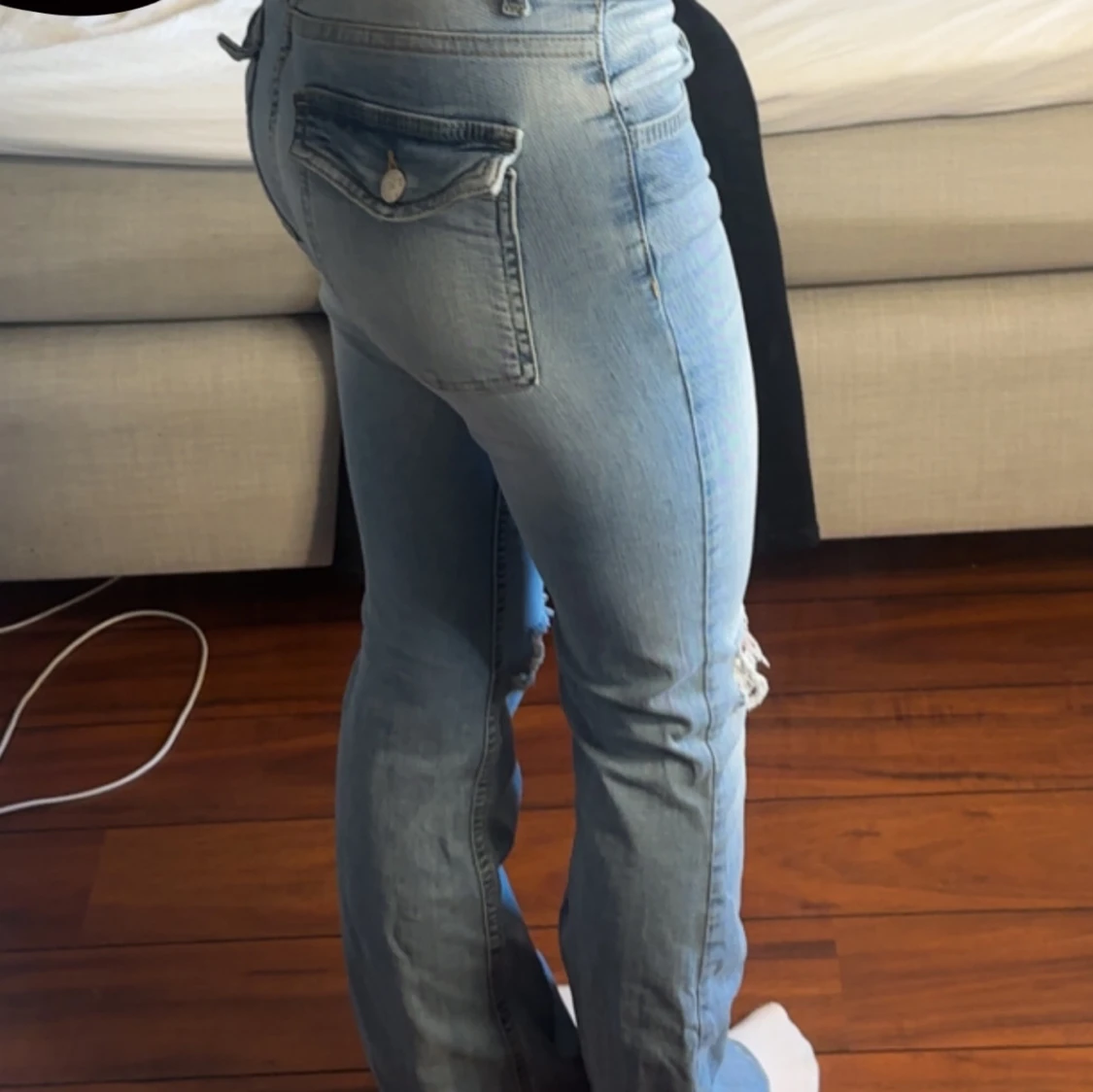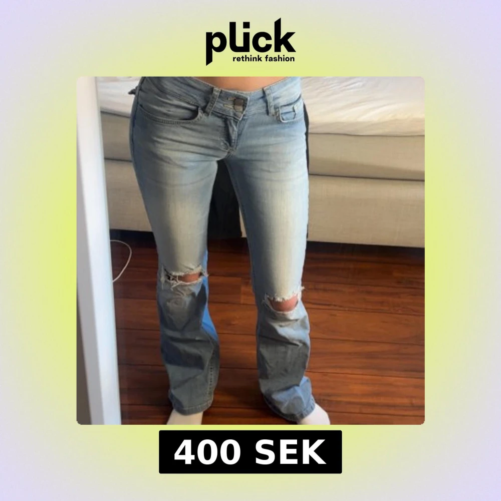 Snygga ljusblå jeans med slitningar på knäna. De har en klassisk femficksdesign och en knappgylf. Perfekta för en avslappnad stil. Aldrig använda😊