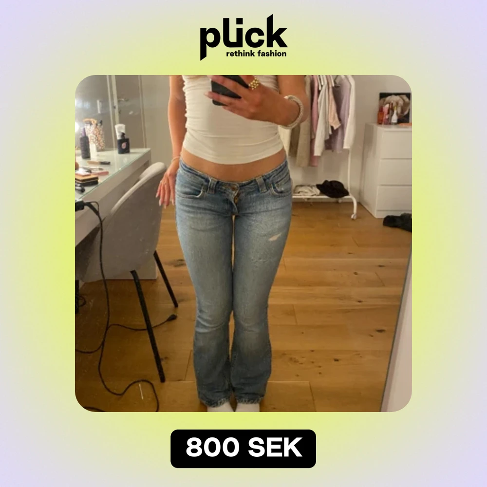 Säljer dessa sjukt snygga utsvängda nudie jeansen, de är lite hål där fram som man ser på första bilden men annars bra skick!💕Innebenslängden är 80 cm och midjemåttet tvärs över är 39💕passar mig perfekt som är 160!💗