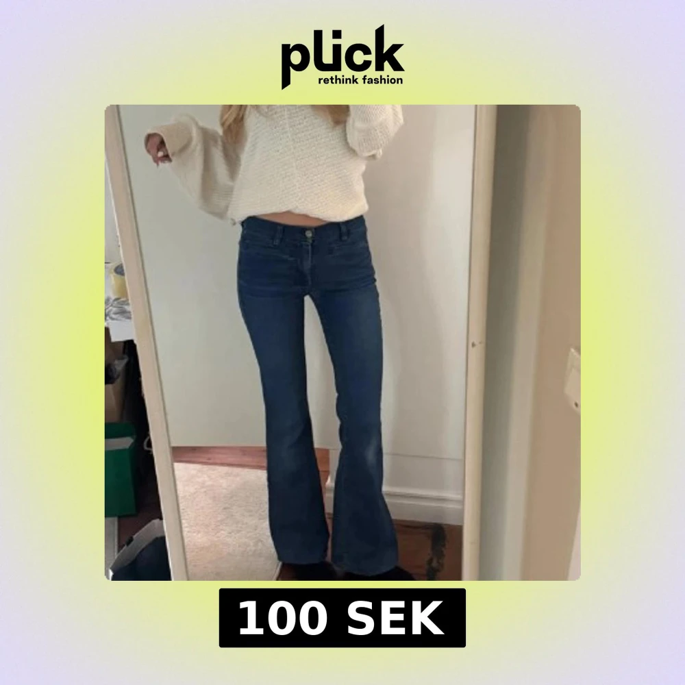 Snygga blå bootcut jeans från MiH Jeans i klassisk denim. Medelhög midja och utsvängda ben ger en retrovibe. Jeansen har fem fickor, bälteshällor och guldfärgade detaljer. Lite slitningar vid skrevet!
