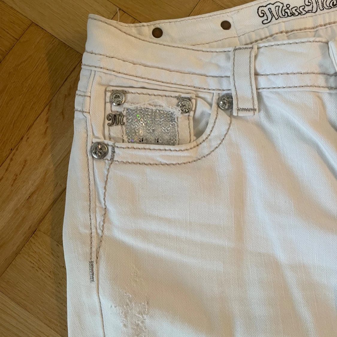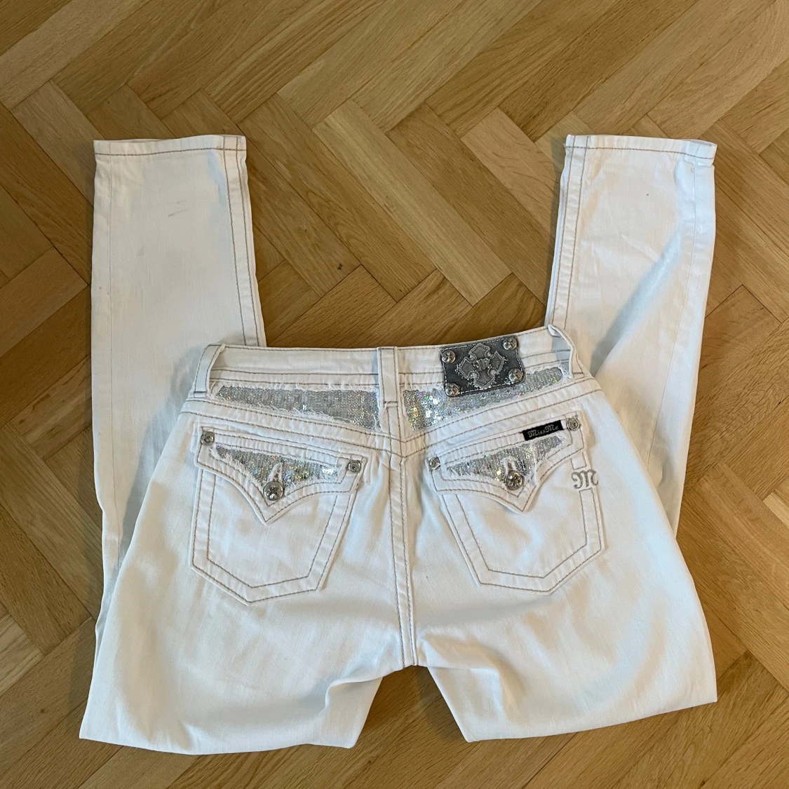 Snygga vita jeans från Miss Me med glittrande paljettdetaljer på bakfickorna och en dekorativ knapp. Perfekta för att ge din outfit lite extra bling! De har en klassisk femficksdesign och en bekväm passform. Lågmidjade och rak passform.