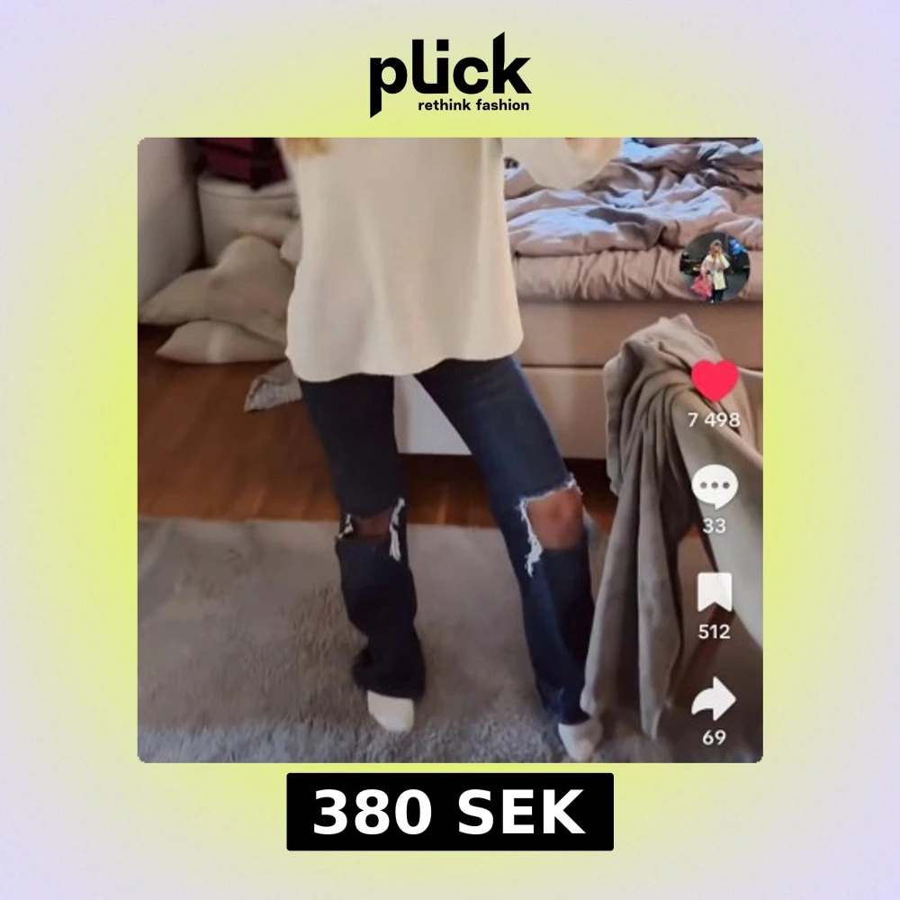 Säljer ett par mörkblå jeans med bootcut passform och stora slitningar över knäna. De är även lowwasited. Skit snygga, om ni vill ha egna bilder kom privat