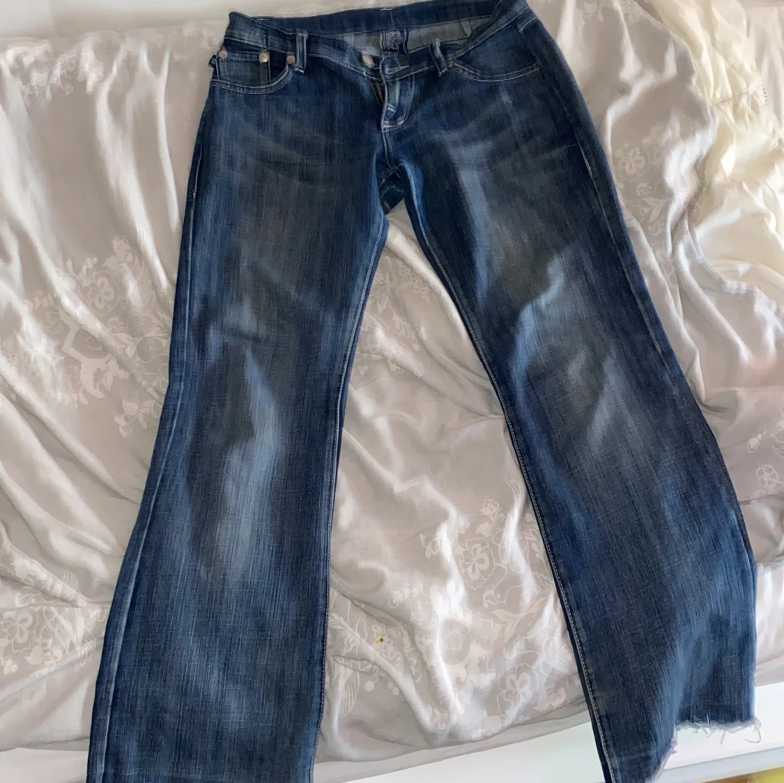 Säljer då de är lite för små på mig. Skulle säga att dem är mer straight än bootcut och dem är cropped. Innerbenslängd-75 midja-40, det är ett insytt hål mellan låren men det är inget man ser när man har på dem😋🔥