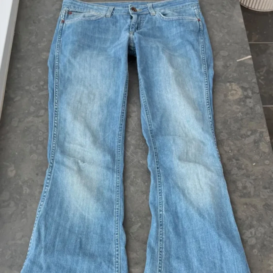 Snygga blå jeans från Wrangler med broderade bakfickor. De har en bootcut-stil. Jag är 166 cm och de går ända ner till golvet. Midjemått: 41 cm Innerbenslängd: 78 cm💗