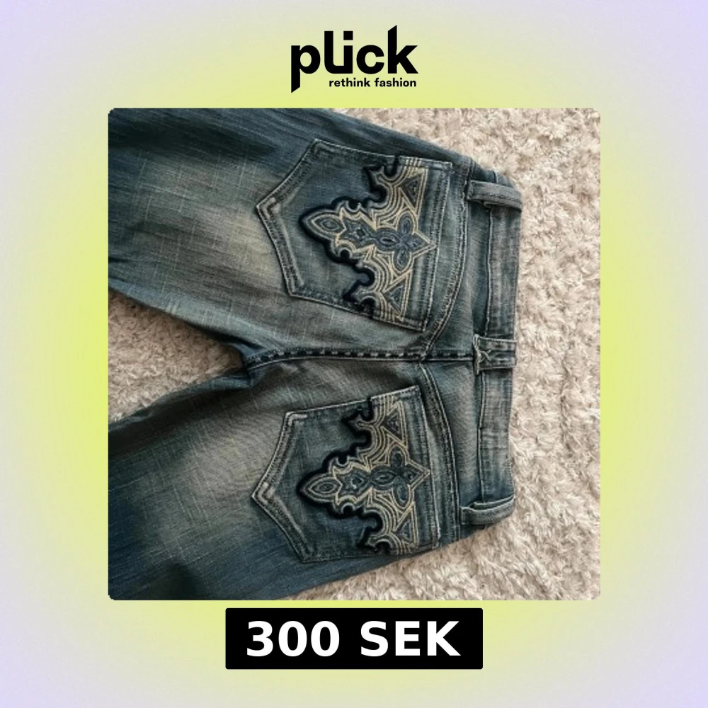 Snygga blå jeans som liknar Miss Me med unika broderade detaljer på bakfickorna och dekorativa sömmar längs benen. Jeansen har bootcut-modell och klassisk femficksdesign. Perfekta för dig som vill sticka ut med coola detaljer och bekväm passform. Skulle säga typ 90 cm innersida lår och sitter väldigt lågmidjat.(jag är 170) passar perfekt